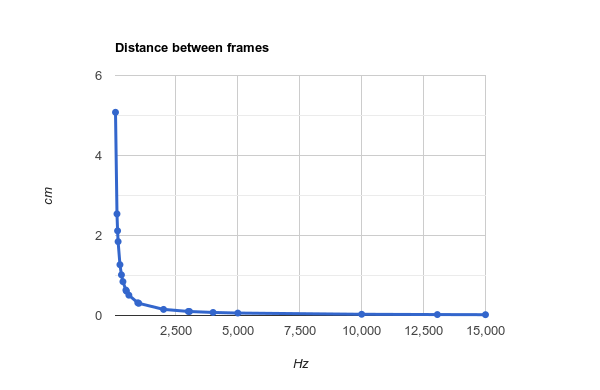 Der Scheitelpunk dieses Graphen liegt bei so ca. 1000 Hz. Hier beträgt die Distanz eines sich schnell bewegenden Objekts zwischen den Frames ca. 3 mm bzw. 13 px. Danach wird es echt schwer noch viel besser zu werden.