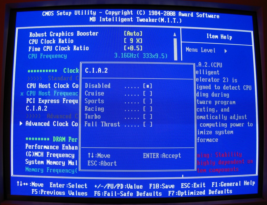 Stattdessen habe ich so ein seltsames CPU Control Menü gefunden, in dem man irgendwas mit seltsamen Bezeichnungen, Turbo ist voreingestellt, aktivieren kann, keinen Schimmer was das genau macht, deswegen hab ichs auch nicht angegriffen, FSB Menü wäre mir lieber...