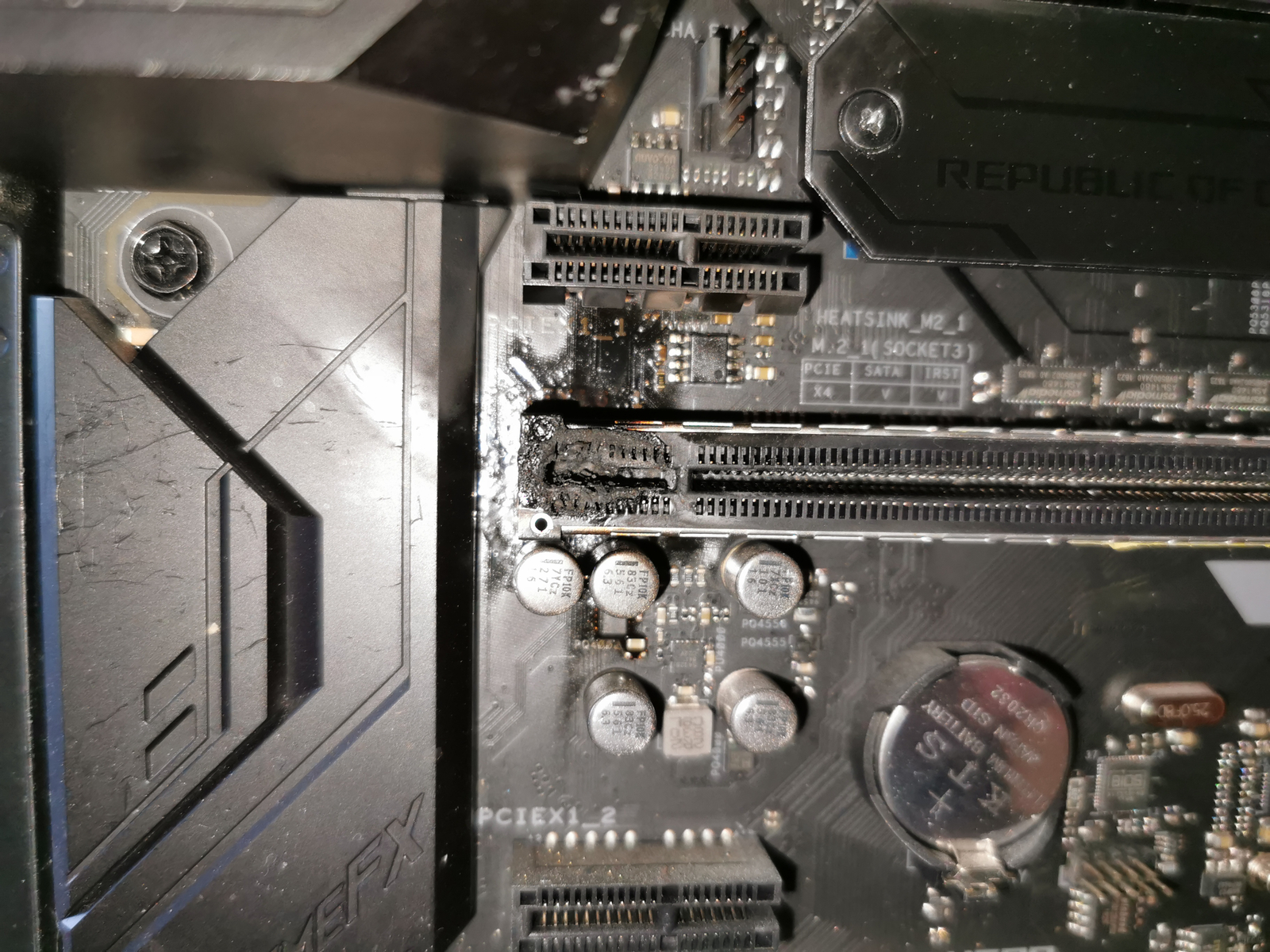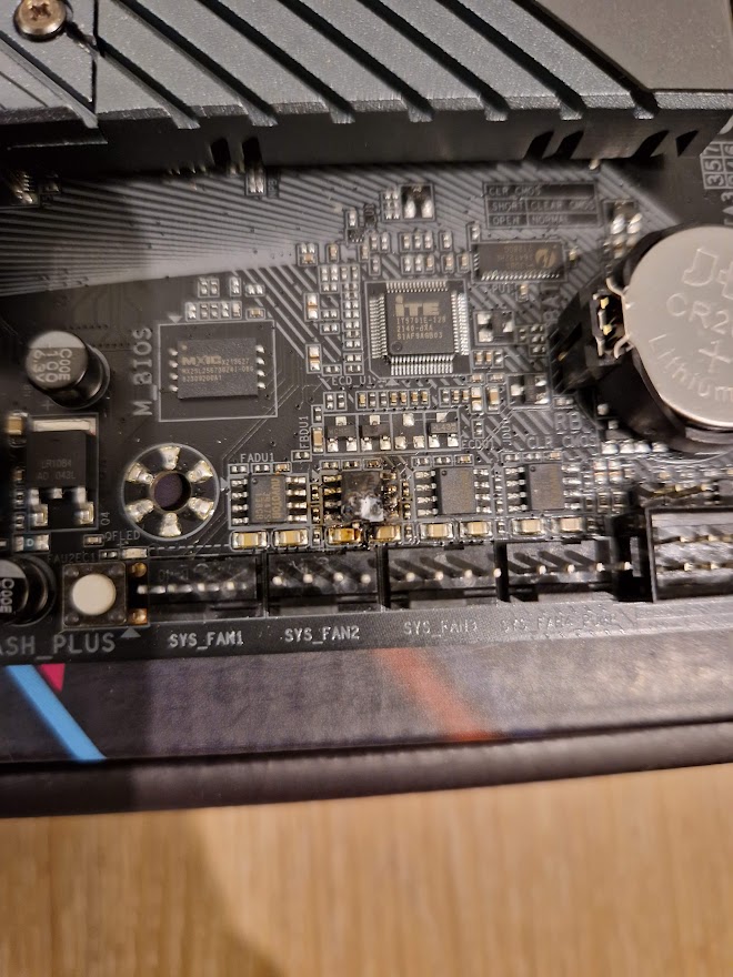 Habe jetzt alles vollständig auseinandergebaut und gesäubert. Das NT, der RAM und die Wakü scheinen in Ordnung zu sein, da ich sie bereits in einen anderen Rechner erfolgreich betreiben konnte. Lediglich auf dem Mainboard sehe ich ein durgeschmorten Kondensator. (siehe Anhang)