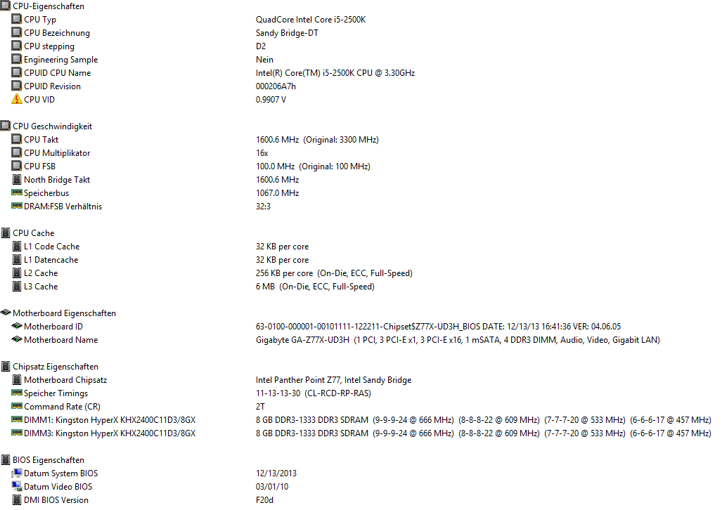 Also, ich habe jetzt die Kingston eingebaut. Wie erwartet wird in Kombination mit meinem aktuellen I5-2500K nur 2133 MHz unterstützt, egal welches von beiden Profilen aktiviert wird. Das ist normal, da alle Z77 Boards 2400 MHz nur in Kombination mit einem Ivy-Bridge (3er Generation) Prozessor unterstützen.