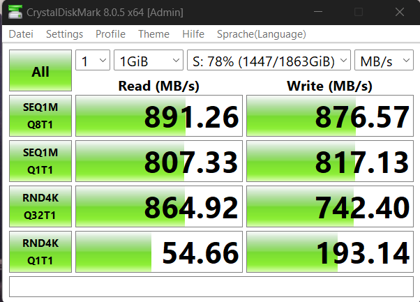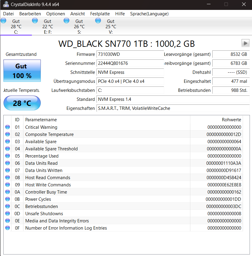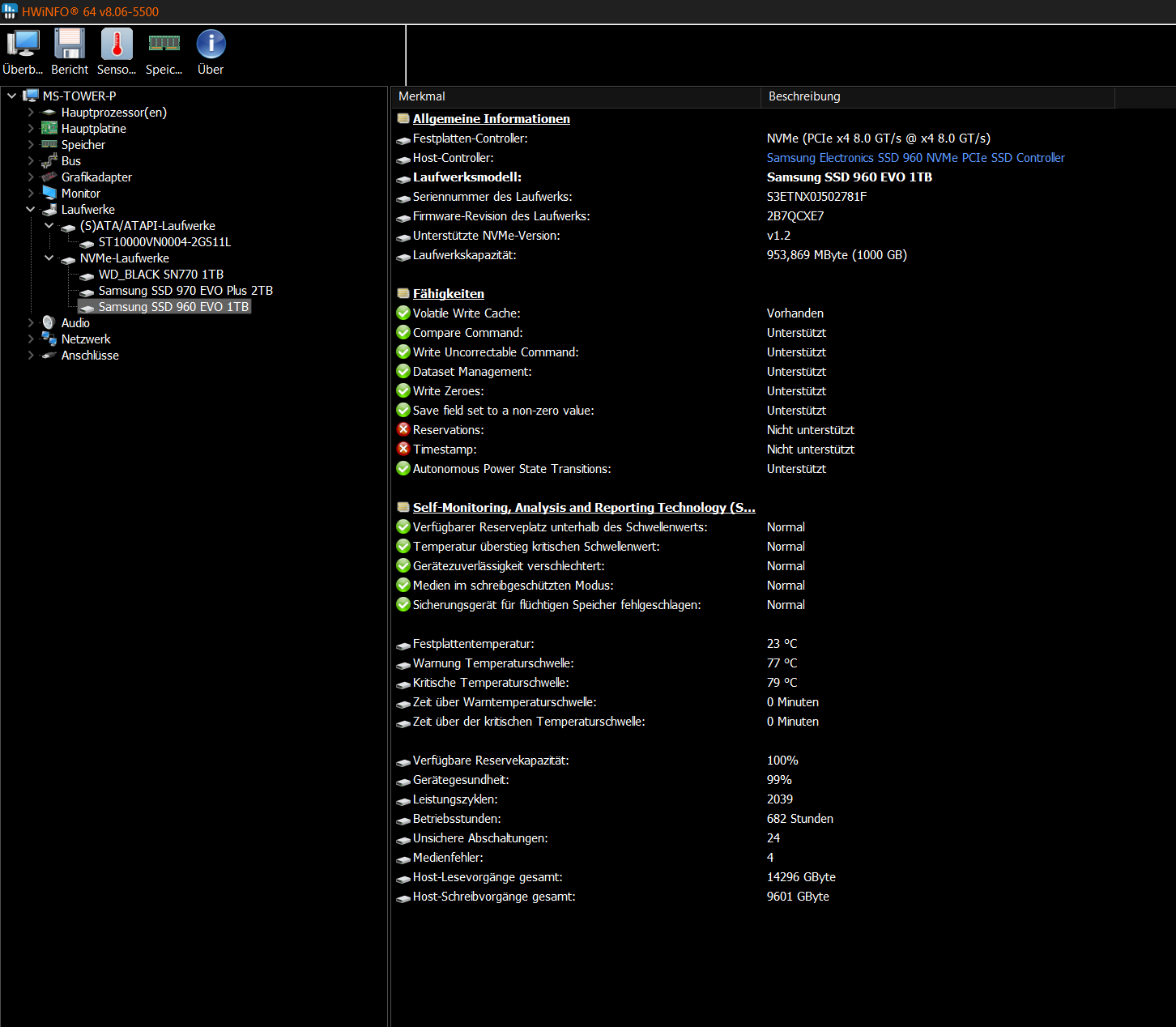 Hinweis: Die SSD 960 EVO soll demnächst gegen WD-Black SN850X NVME SSD 4 TB ersetzt werden. Eine weitere NVME Samsung 990 EVO 2TB wird mit UGREEN Gehäuse-Adapter per USB-C hin und wieder angeschlossen (und läuft verdammt schnell).