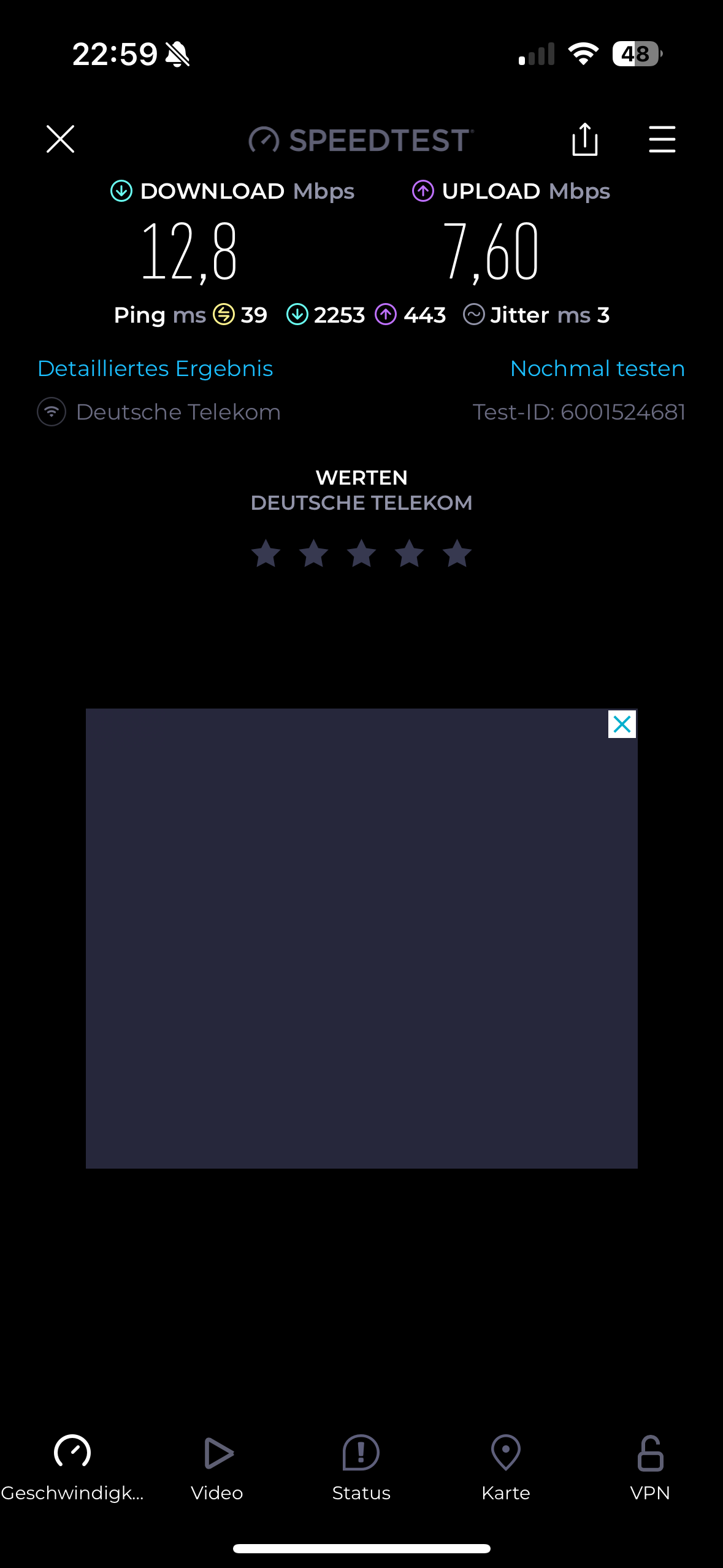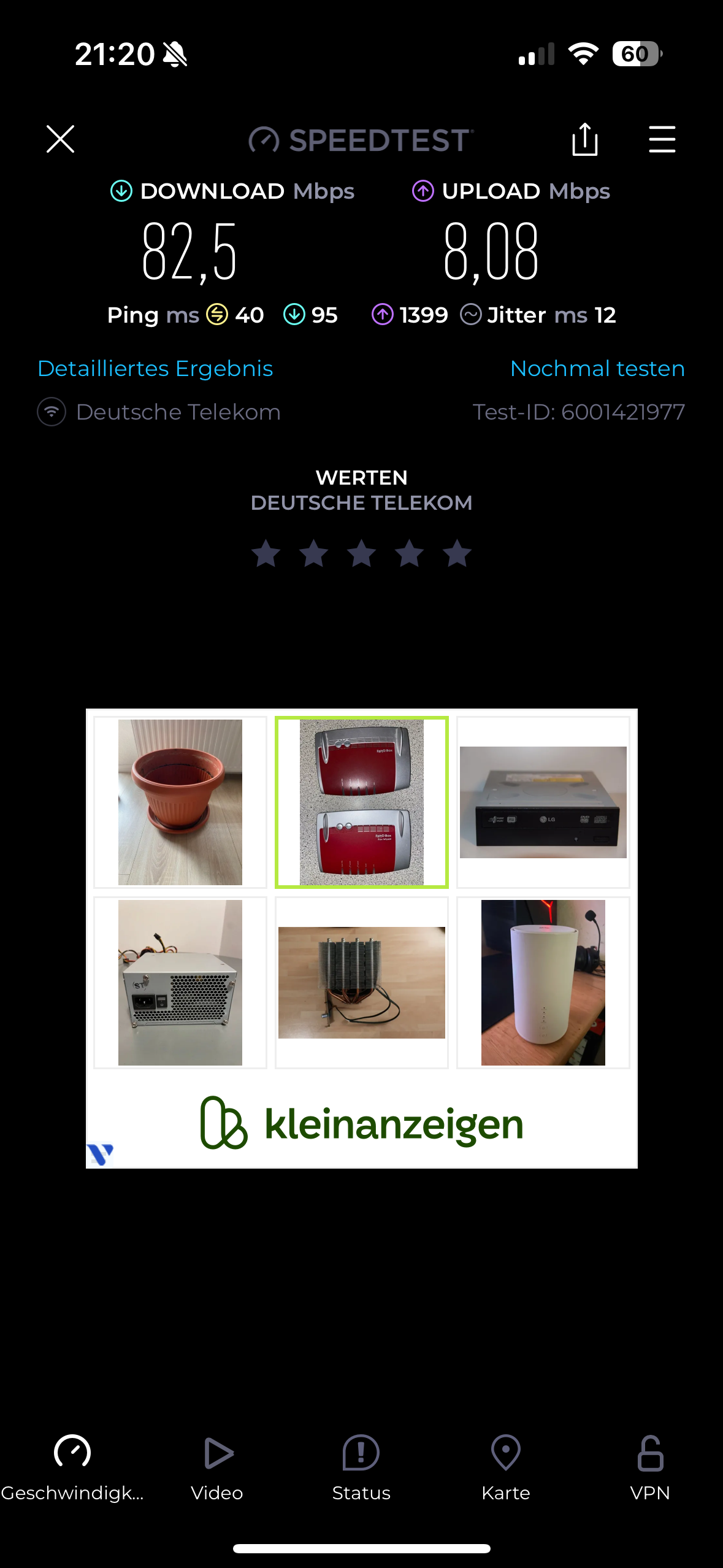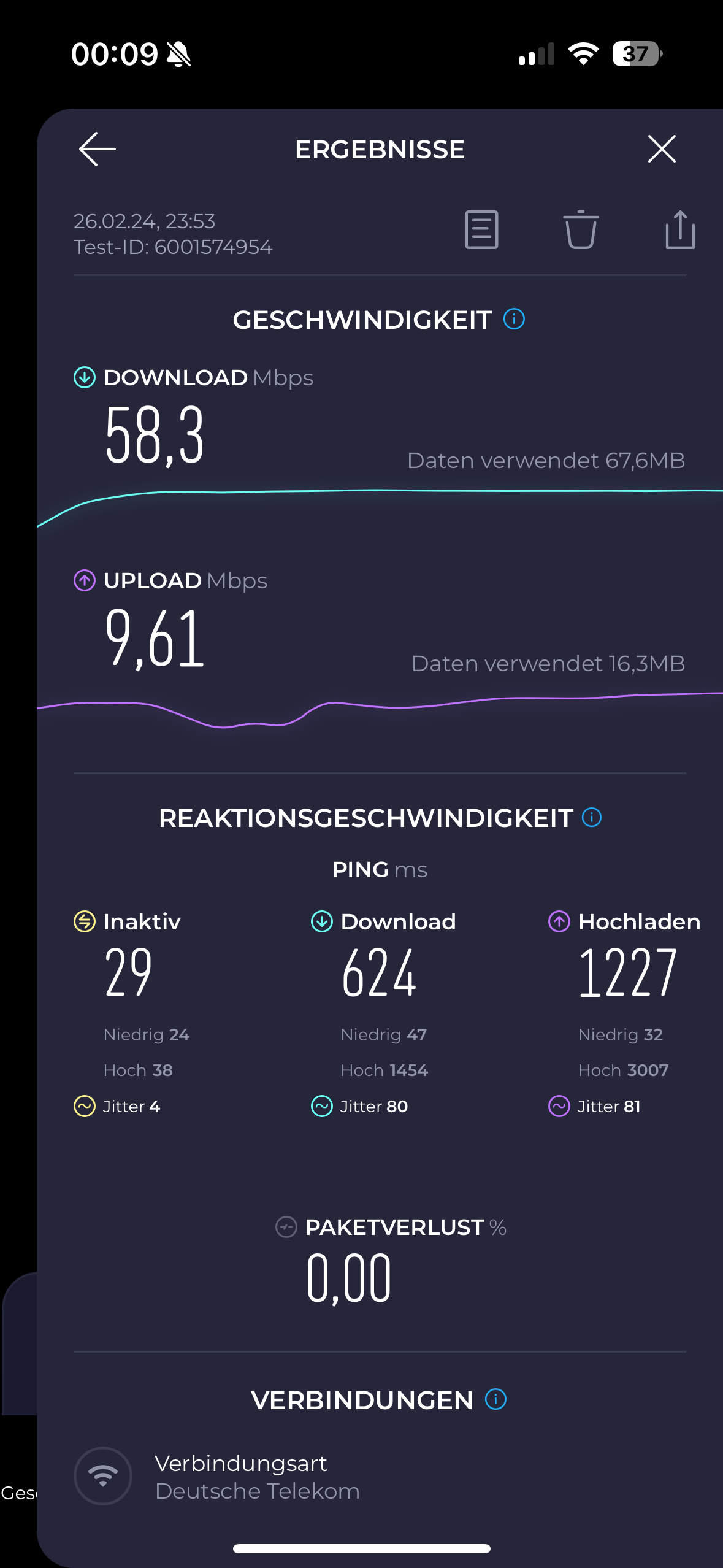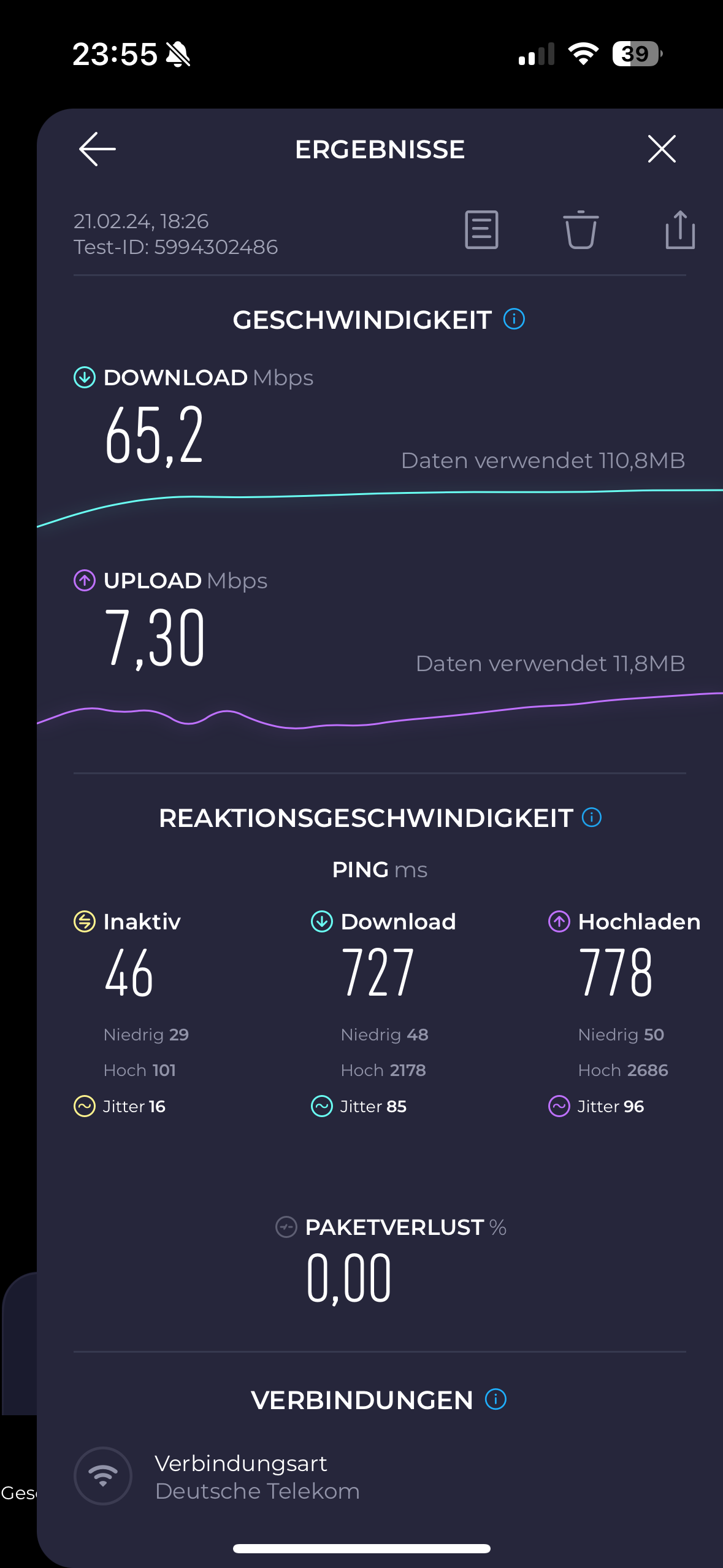 komisch ist das der ZTE bei mir zuhause nur 47 im down und 5 up aber nur 25ms