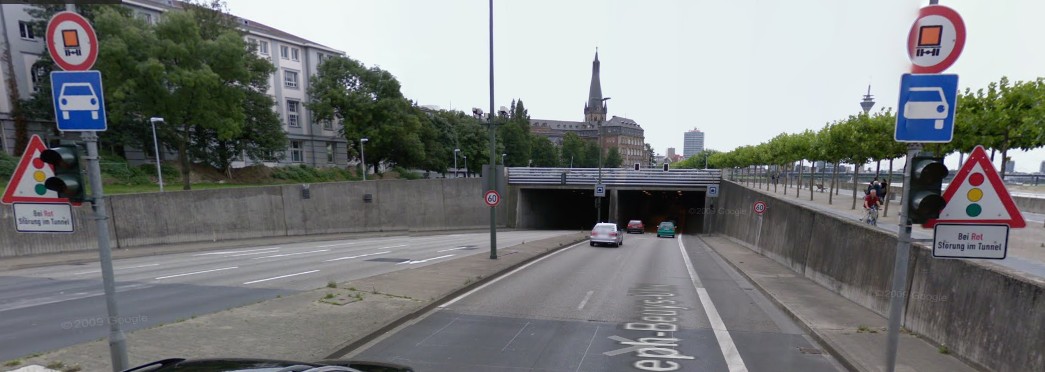 Der Rheinufertunnel. Eine Kraftfahrtstrasse. Man beachte das blaue Schild. Und sofort das 60 km/h Schild. Weil auf diesen Strasse nicht die innerörtlichen Bedingungen gelten.