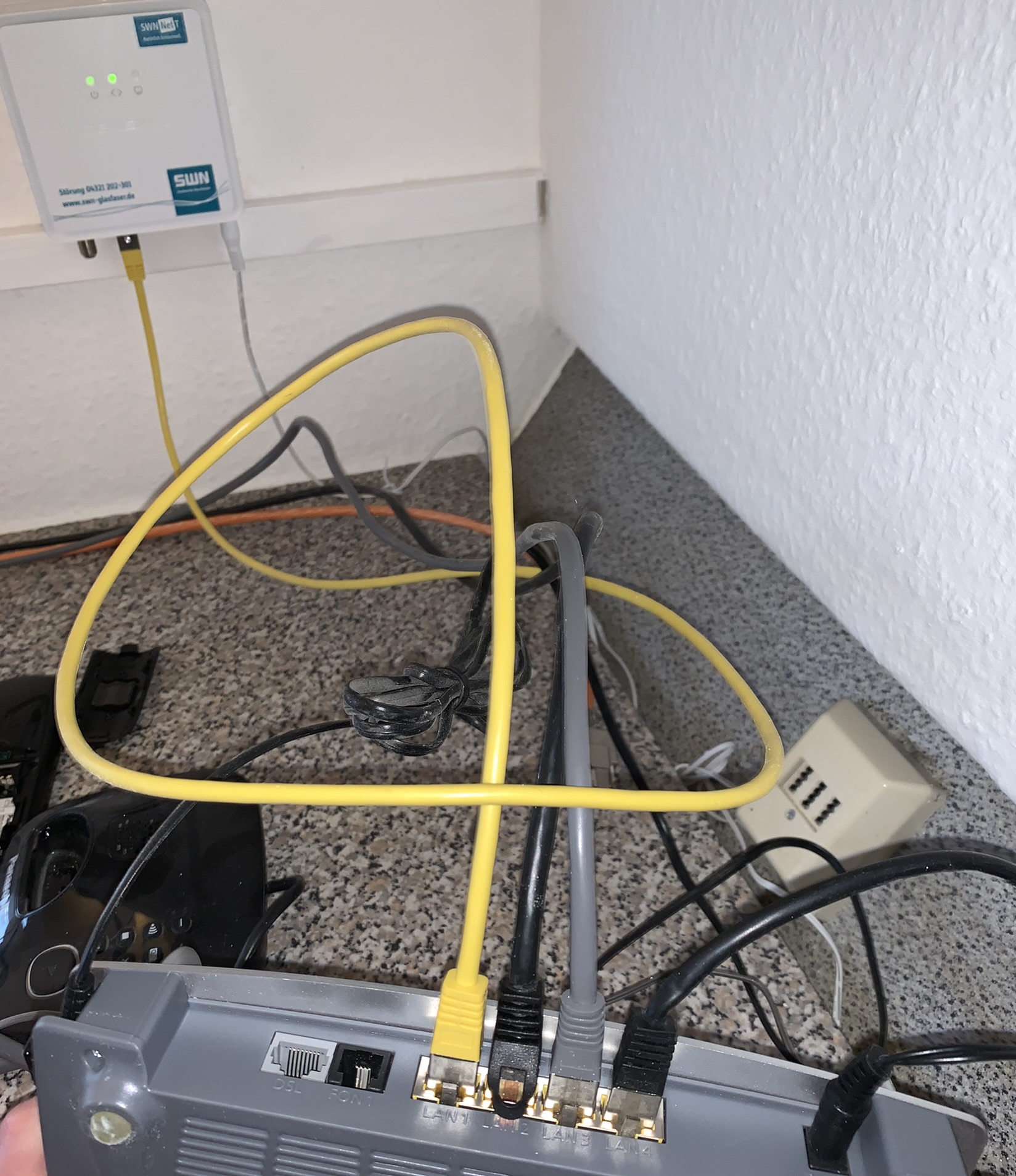 Das Glasfaser-Kabel kommt im Keller an und das Glasfaser-Modem hängt oben in der Wohnung neben der Fritzbox 7560.