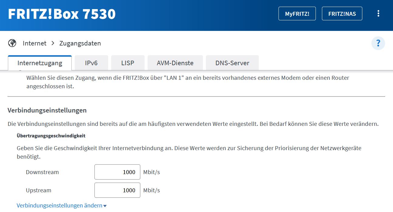 2. In den Fritzboxeinstellungen hatte ich zwar in den Interneteinstellungen die korrekte Uploadrate von 500 MBit/s angegeben (Upstream), aber die Crux ist, dass die Box das irgendwie drosselt. Ich habe den Wert einfach auf 1000 MBit gesetzt und danach hat sich die Uploadrate auf stabile 525 MBit/s erhöht.