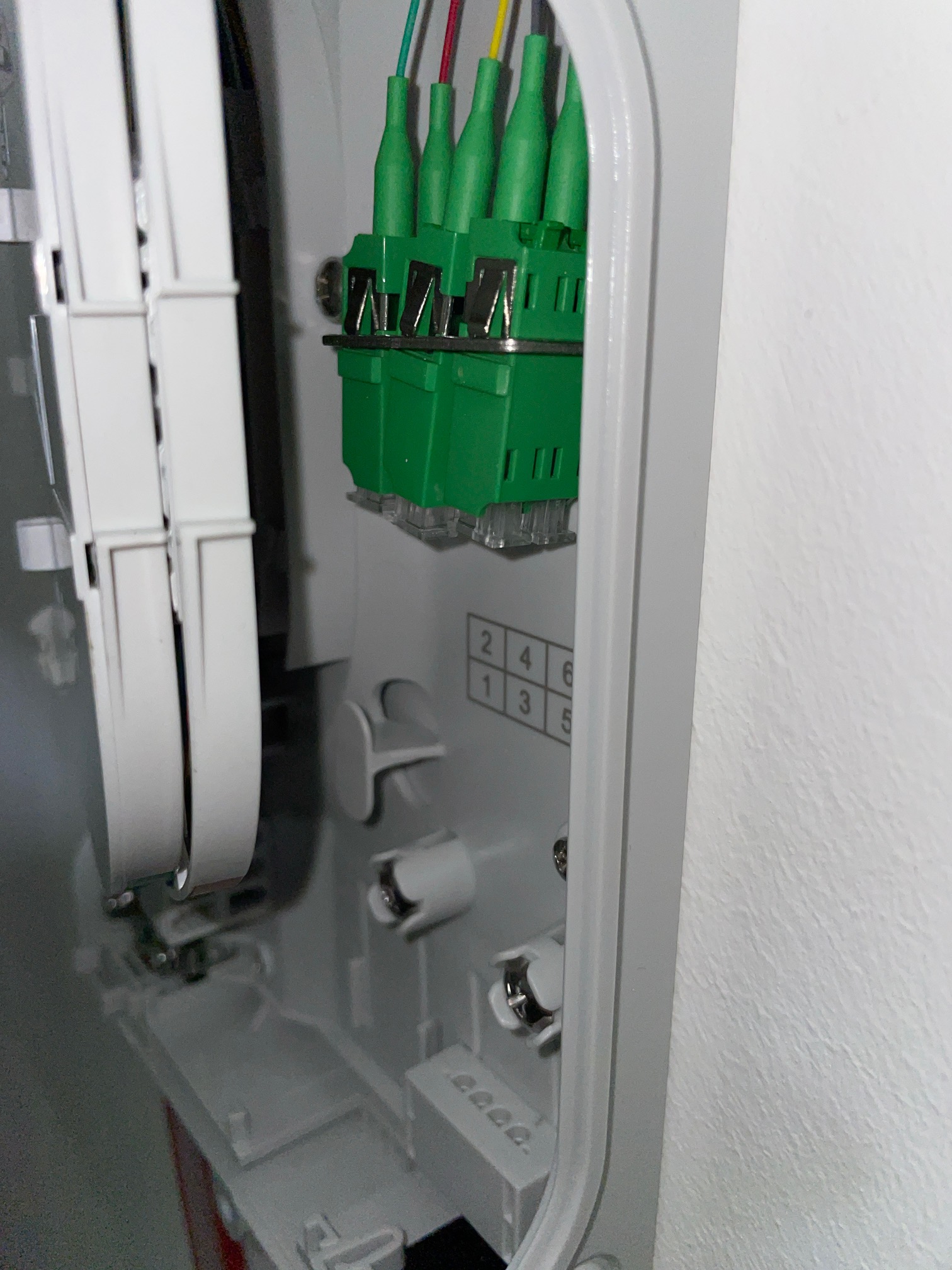 Ich habe von dem nicht vorhandenen drei Fotos eingefügt. Fertig sieht es aber selbst im Haus wirklich nicht aus. Der Hausübergabepunkt ist installiert, die Glasfaser ist aufgespleißt aber einen Anschluss nach Außen gibt es von der Box nicht. Es sind aber drei optische Doppelstecker vorhanden, die aber lediglich in der Box abgreifbar sind, wenn man die Box aufschraubt. Wenn ich das richtig sehe, ist nur rot / 1 überhaubt angebunden (man sieht rechts, dass es nur eine Verbindung gibt), der Rest ist zwar da aber scheinbar nutzlos.