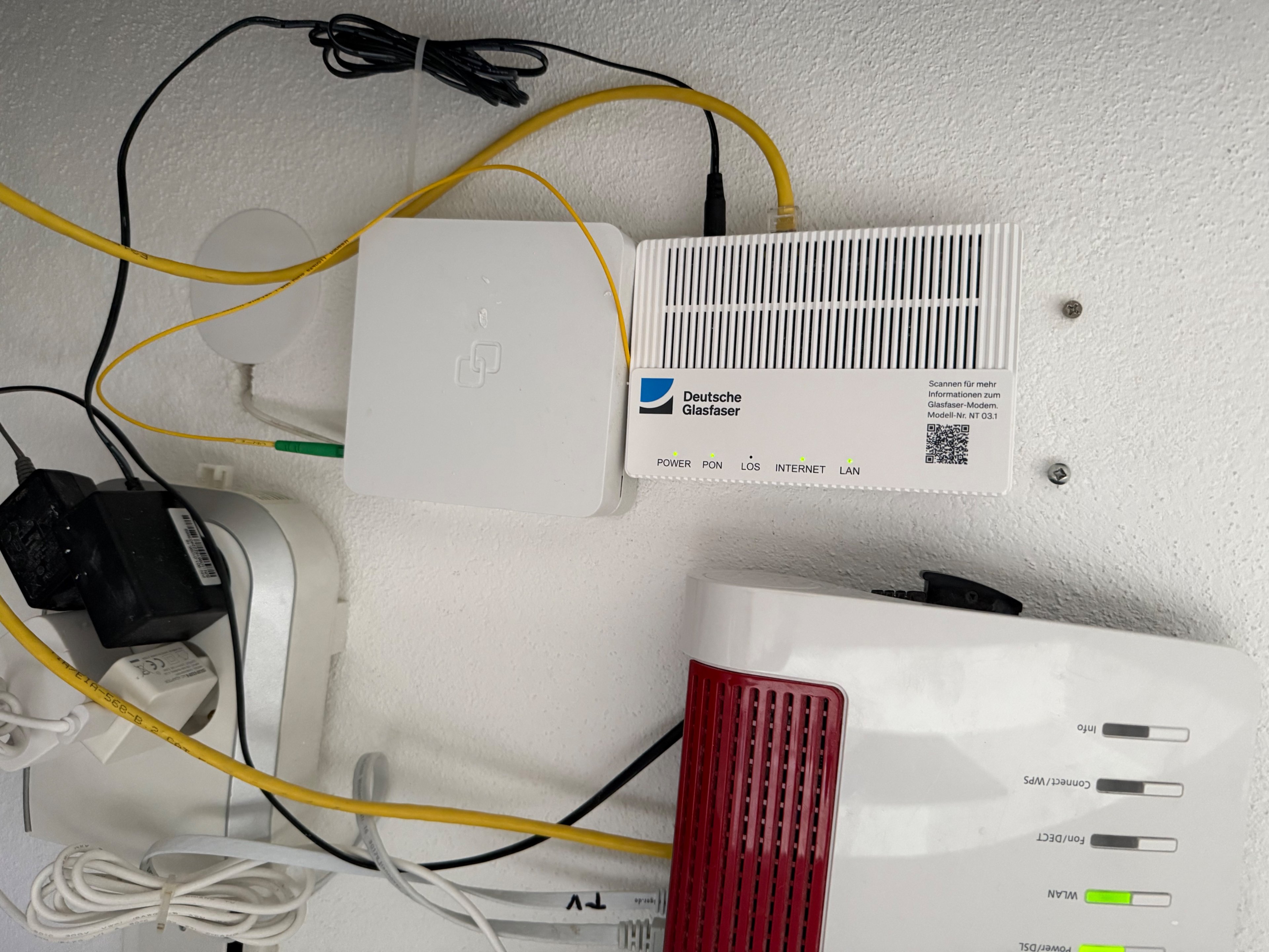 Hi,sorry für den nicht so informativen Thread ,ich habe leider nicht viel Ahnung von allem.Also die FRITZ!Box 7590 ist per lan Kabel am pc verbunden .den pc habe ich neu ausgetauscht und von einem it Techniker fit machen gelassen.Der pc ist es definitiv nicht .lan Kabel habe ich 2x getauscht,nichts.ueber handy wlan ist der Speed fast immer besser und stabiler als am pc per LAN kabel.reset FRITZ!Box ist auch erfolgt,habe ja sogar eine neue bekommen.ich mache mal ein Foto von der Technik ,ich weis das die bisschen unordentlich aussieht aber das mal außen vor 😬Was heißt genau Netzwerk prüfen ?wen könnte ich da ggf. beauftragen um mir da vor Ort zu helfen ? Glasfaser hat bis jetzt noch nicht viel gemacht.die FRITZ!Box habe ich direkt von dt Glasfaser bekommen.bezweifle aber das da das Problem liegt,da die FRITZ!box von 1und1 bei dsl ja das gleiche Problem hat und vor nem Jahr einwandfrei funktioniert hat.Wenns geht bitte genauer erklären was ich tun könnte,habe echt garkeine Plan 😒