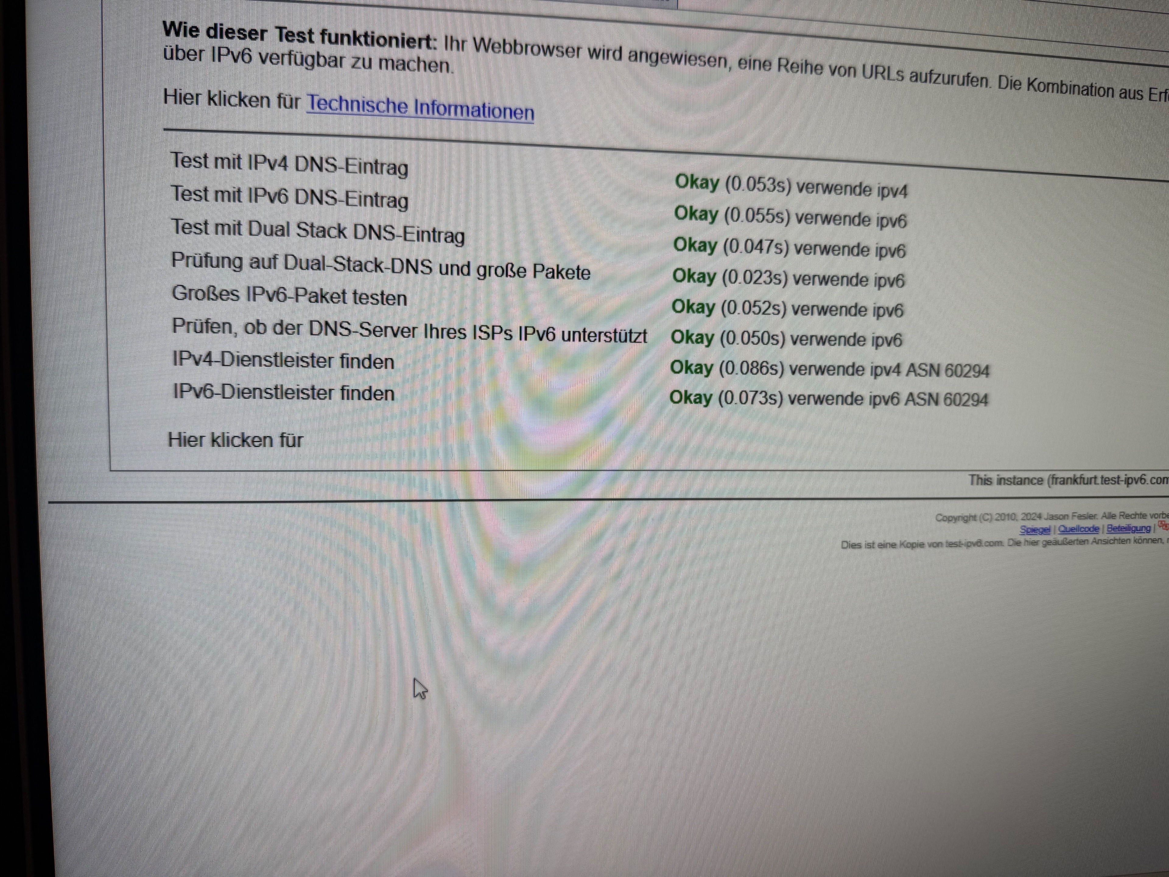 Dann rufe bitte mal diese Seite auf: https://test-ipv6.com/
