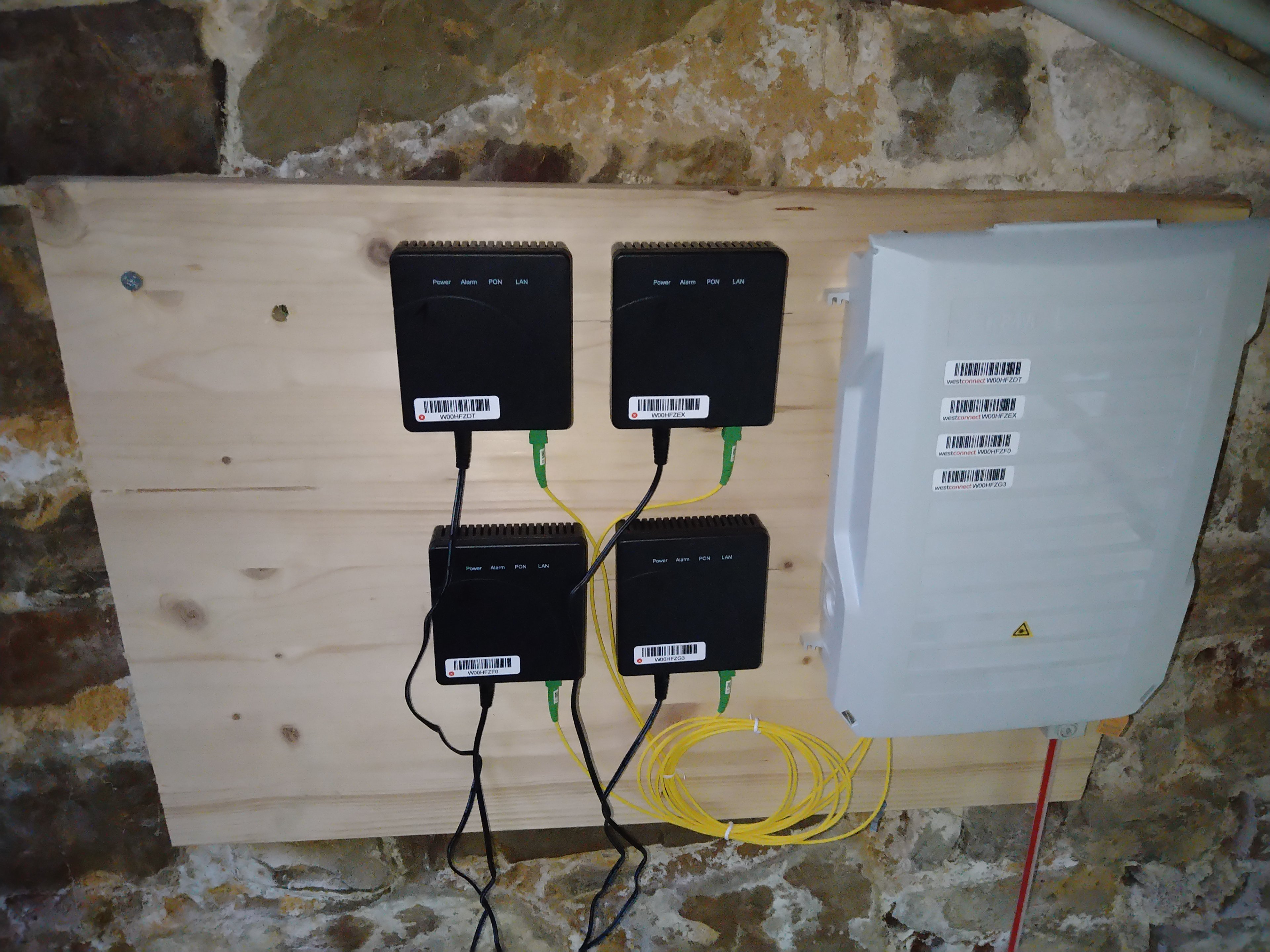 Nächstes Bild, jetzt wird es Interessanter das weiße ist der APL oder auch GF-TA genannt, hier wird dir prinzipiell die Glasfaser zur Verfügung gestellt. So jetzt kommen wir zu den schwarzen Kisten, diese sind die sogenannten ONT (Laiensprachlich: Glasfaser-Modem), die sind dafür da um die Glasfaser umzuwandeln in eine RJ45 Netzwerkfähige Verkabelung.