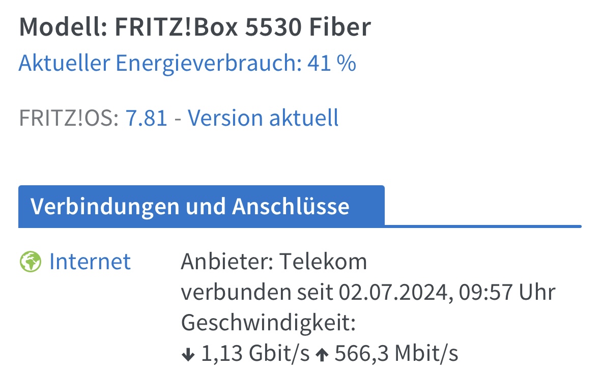 Im alten 1.000/200 Tarif sind es ↓ 1,13 Gbit/s ↑ 283,3 Mbit/s.