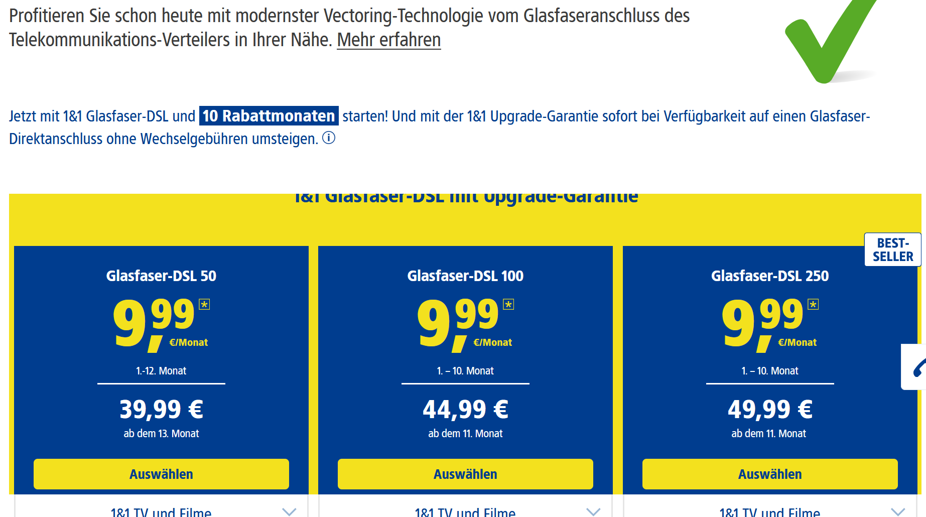Nuja schon, aber das Resultat der (im Artikel verlinkten) "Ist bei mir Glasfaser verfügbar?"-Abfrage resultiert in einem klaren "Ja!" und listet dann die "Glasfaser"tarife auf die dann halt irgendwie so ähnlich heißen. Und ja, das halte ich für etwas fragwürdig. Egal wie "technisch gesehen vielleicht ein bisschen richtig" das sein mag.