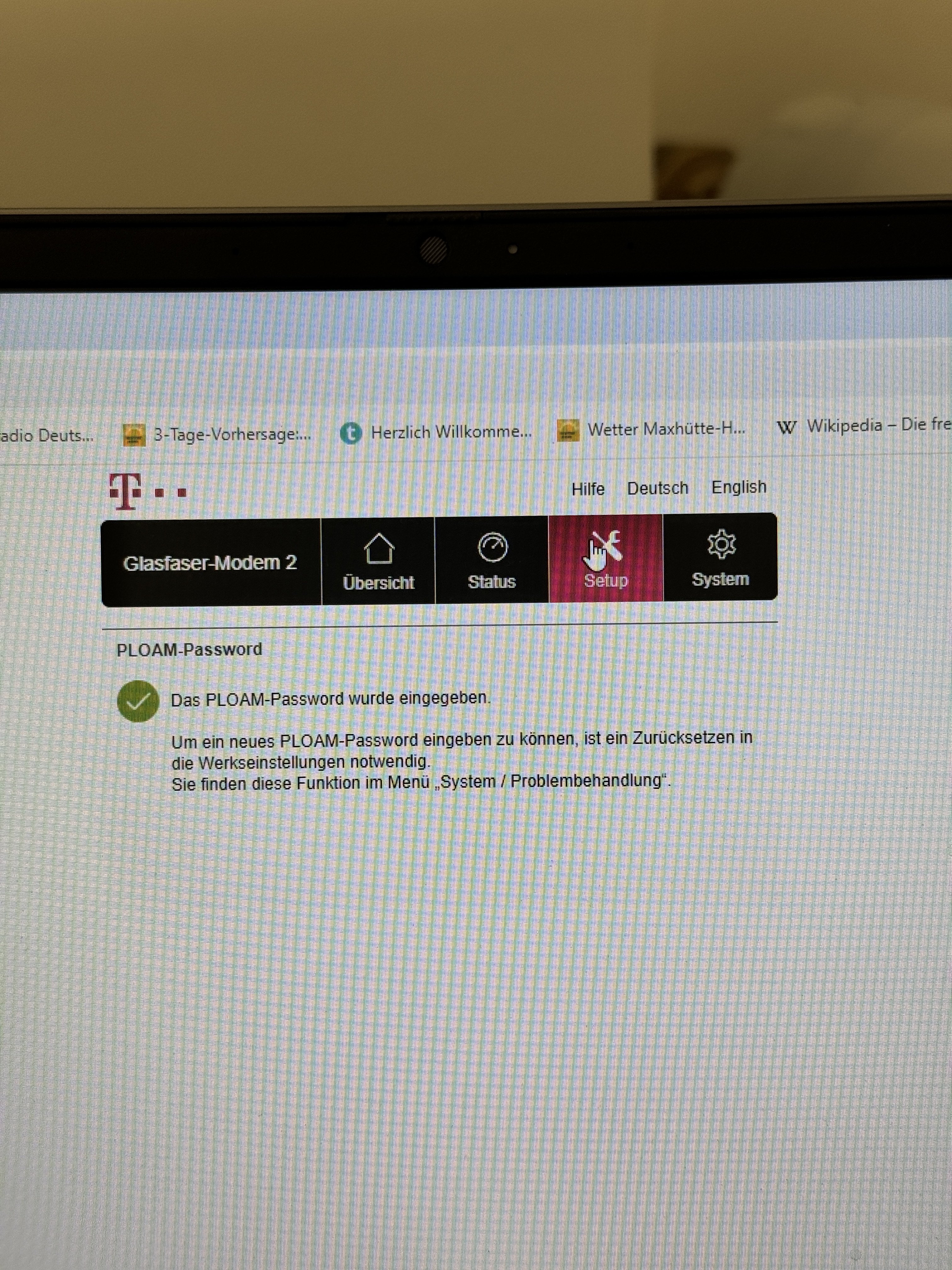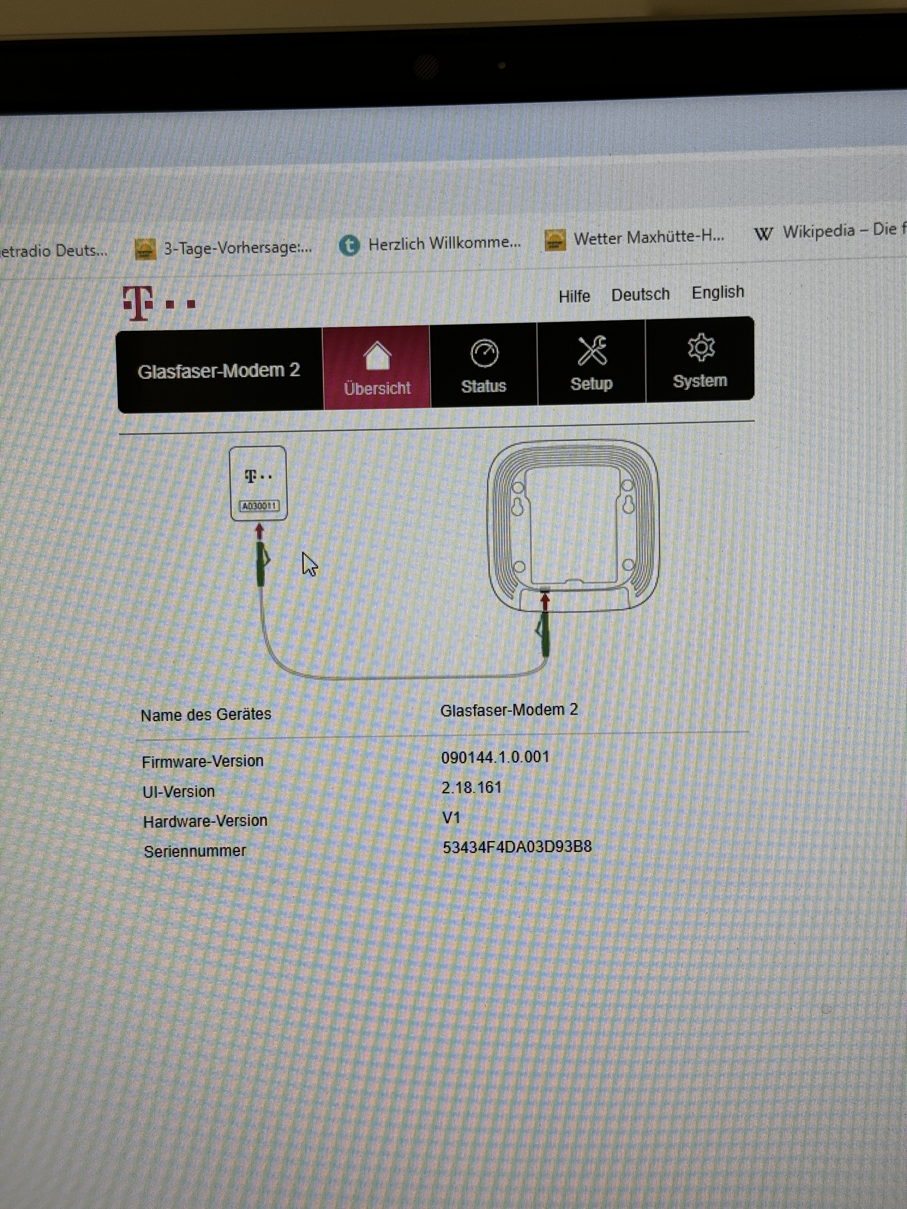 Ich möchte nun Probleme mit der Hausinstallation ausschließen: Der Telekom-Hotline Mitarbeiter meinte daraufhin zu mir, ich solle den Laptop mit einem LAN Kabel (CAT 7) direkt an das "Telekom Glasfasermodem 2" anschließen und schauen ob ich dann Internet habe.