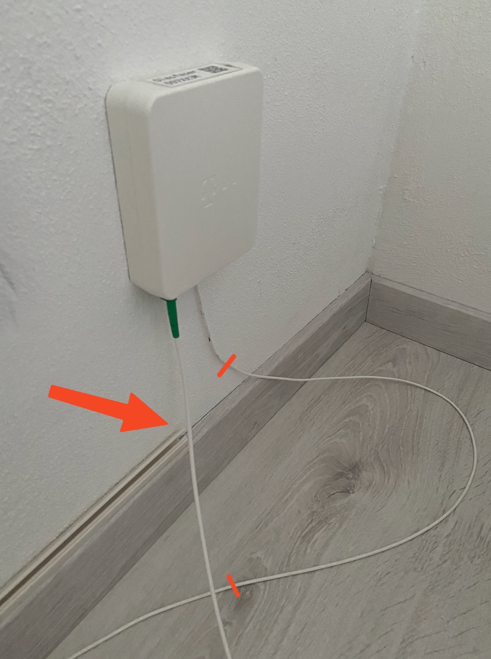 Durch den Wechsel "Kanal von Decke auf Fussleiste" hat es sich ergeben, dass das Kabel im Wohnzimmer - wo es in die Glasfaserdose kommt - ca. 30cm zu lang ist, bei Austritt aus dem Kanal.