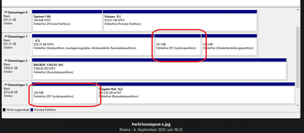 Ja, ich bin sicher. Datenträger 3 hängt erst seit gestern dran, ist frisch aus der Packung und so mit dieser EFI-Partition gekommen. Die ist im Übrigen leer wie ein umgestülpter Eimer.