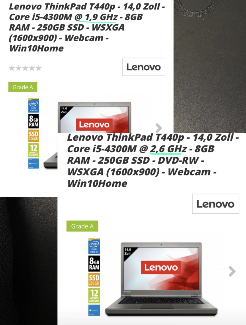 Hallo, will mir das thinkpad t440p für office Tätigkeiten kaufen und aufrüsten. Kann mir wer erklären warum trotz gleicher cpu unterschiedliche Ghz vorhanden sind? Der mit 1,6Ghz ist 50€ günstiger. Ich kenne mich damit nicht so aus, also Entschuldigung falls ich irgendwas offensichtliches verpasst habe!