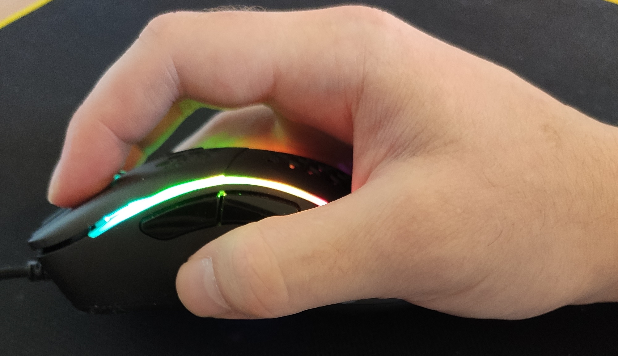 Die Model D- ist in der Form ähnlich zu der Zowie EC2 und fühlt sich angenehm in der Hand an. Meine Hand ist etwa 19cm x 9,5cm groß. Die linke Seite der Maus und damit auch der linke Button liegen leicht höher. Der Fingergroove für den Daumen ist nicht so stark ausgeprägt wie beispielsweise bei der Roccat Kone Pure Ultra, bietet jedoch ausreichend Halt für den Daumen. Die Position des Daumens befindet sich durch die Einkerbung recht weit vorne und liegt damit auch vor dem Sensor. Dadurch kann es bei einer rotierenden Bewegung der Maus leicht gewöhnungsbedürftig sein. Die Mainbuttons haben beide einen kleine Einkerbung wodurch die Finger rutschsicher auf den Buttons liegen. Sie ist im gesamten ein Stück höher und länger als die KPU und auch leicht höher als eine GPW. Die rechte Seite bietet ausreichend Platz für zwei Finger. Für einen Palm Grip ist sie für die Größe meiner Hand nicht so gut geeignet, denn sie ist ein kleines bisschen zu kurz. Mit einem Claw Grip fühlt sie sich optimal an. Auch für ein Fingertip Grip ist sie sehr gut geeignet. Man merkt absolut nichts von der Honeycomb Struktur wenn man sie normal in der Hand hält. An den Seiten befinden sich keine Löcher.