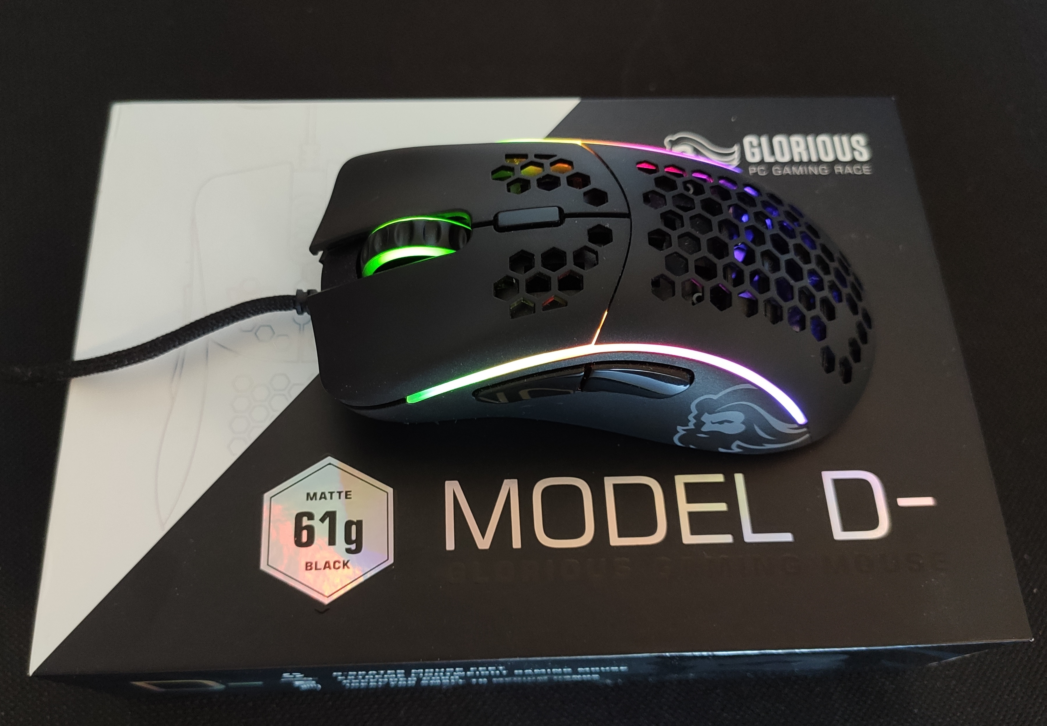 Die Glorious Model D- ist die kleinere und leichtere Version der Model D. Die ergonomische Model D- bringt 61g auf die Waage, kommt mit einem PixArt PWM3360 Sensor, Omron 20m Switches, einem Ascended Cord Kabel, 100% PTFE Mousefeet und mit der Glorious typischen RGB Beleuchtung. Ich teste die Maus in der Matte Black Version. Es gibt außerdem noch Matte White sowie Glossy Black und Glossy White.