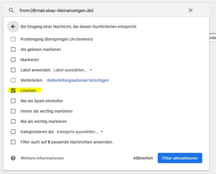 Daher wollte ich mit der Gmail-Filterfunktion einfach alle Emails, die von "@mail.ebay-kleinanzeigen.de" verschickt werden blockieren bzw. löschen lassen.