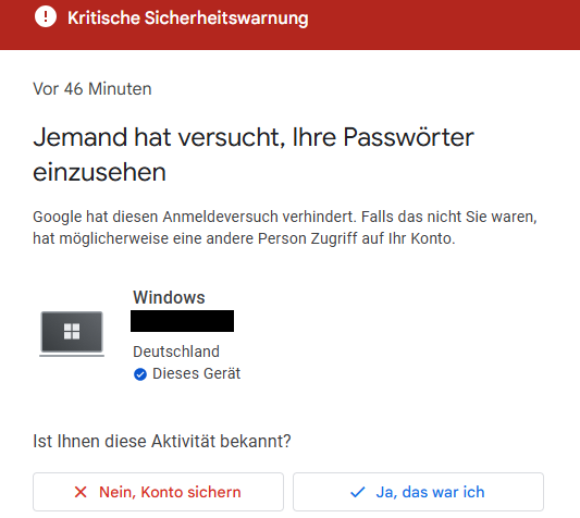 Jetzt gerade bekam ich die Meldung, dass "Jemand hat versucht, Ihre Passwörter einzusehen". Siehe Bilder.