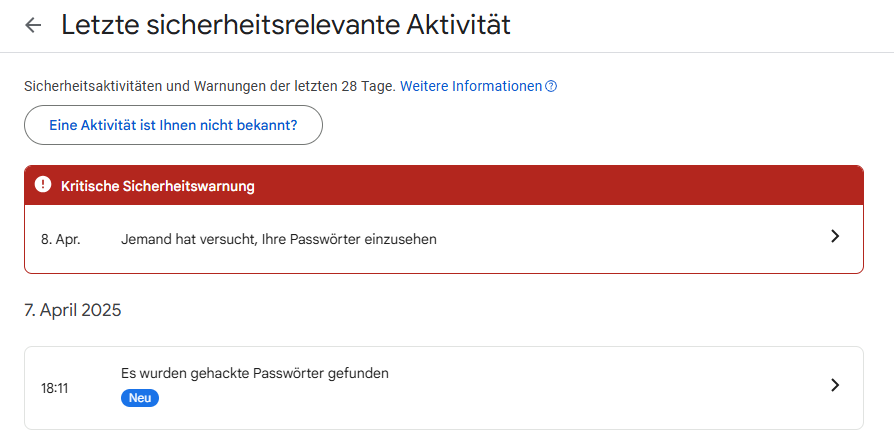 Ich dachte dabei, dass Google Datenbanken mit haveibeenpwned.com abgleicht und mich darüber informiert.
