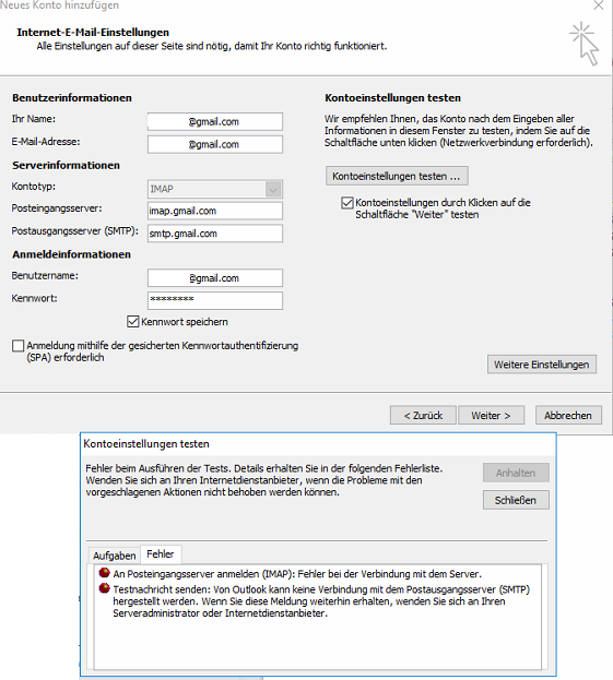 Ich habe das Problem, dass ich mein privates E-Mail Konto im Outlook 2010 nicht einrichten kann ("Siehe Fehlermeldung")