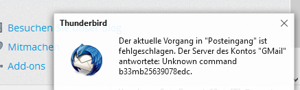 nutzt hier noch jemand Thunderbird für den Abruf seiner Mails von Google ? Das funktioniert bei mir seit heute morgen nicht mehr. Wenn ich im Thunderbird auf "Posteingang" klicke, erscheint: