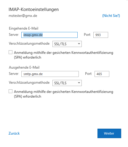Gut, dann muss ich das halt machen. Ich ändere die Verbindungsdaten in Outlook also auf die Daten, die ich bei gmx gefunden habe: