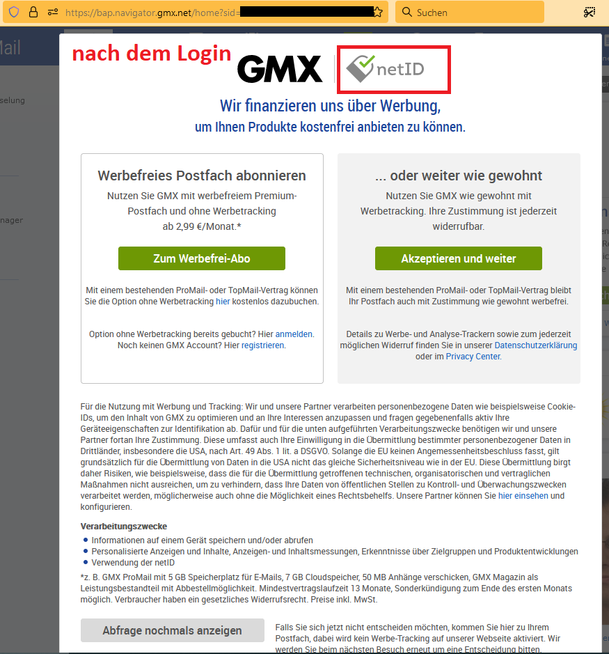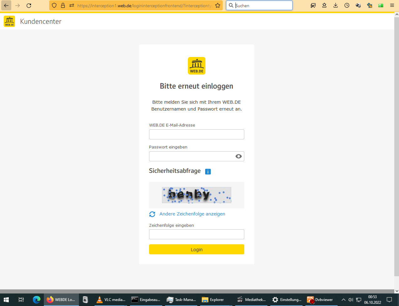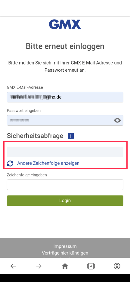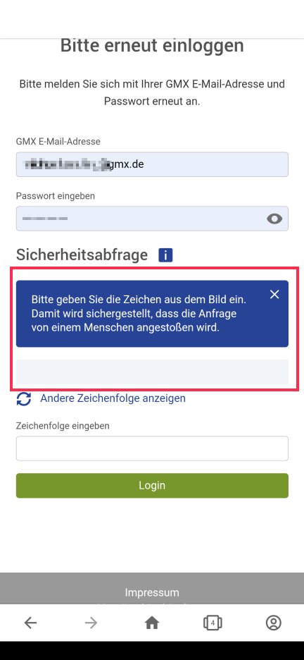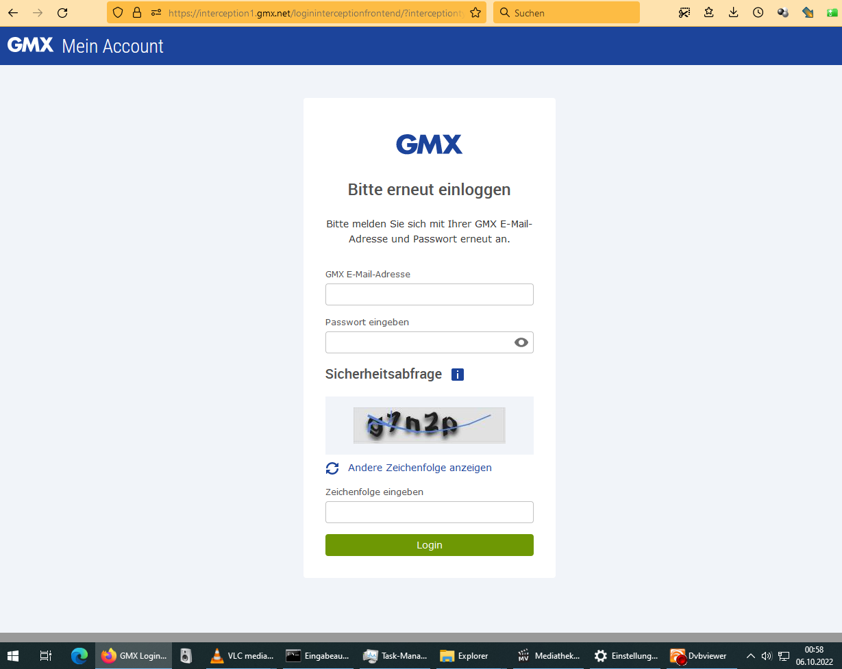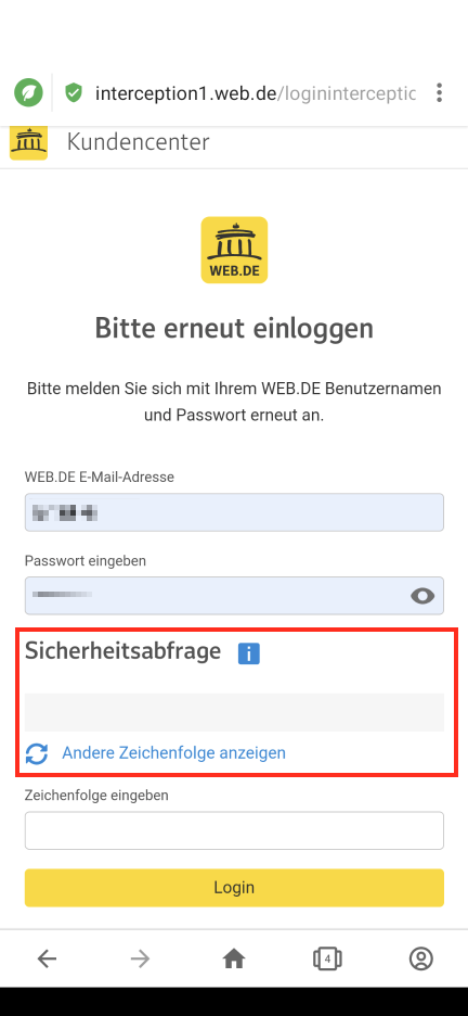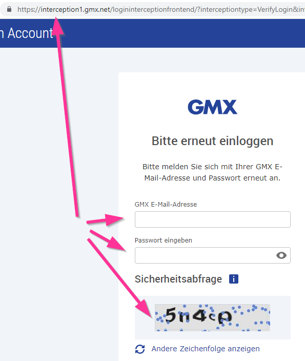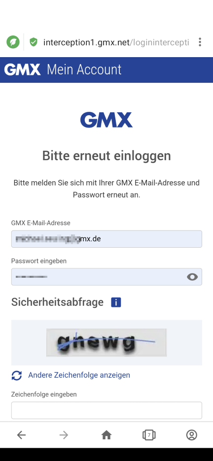 Nach dem Login wird man erneut aufgefordert , seine Mail Adresse und PW einzugeben , und ein Captcha !
