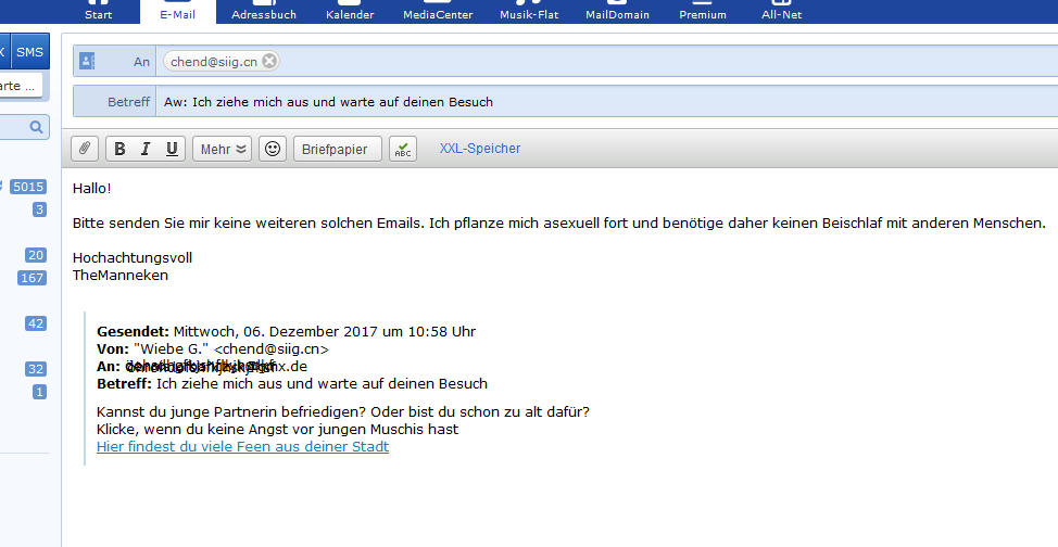 Ich habe eine Email bekommen (eine Spammail, aber das tut rein gar nichts zur Sache). Wenn ich auf "Antworten" klicke, sieht das Ganze folgendermaßen aus und meine Antwort schreibe ich darüber wie abgebildet:
