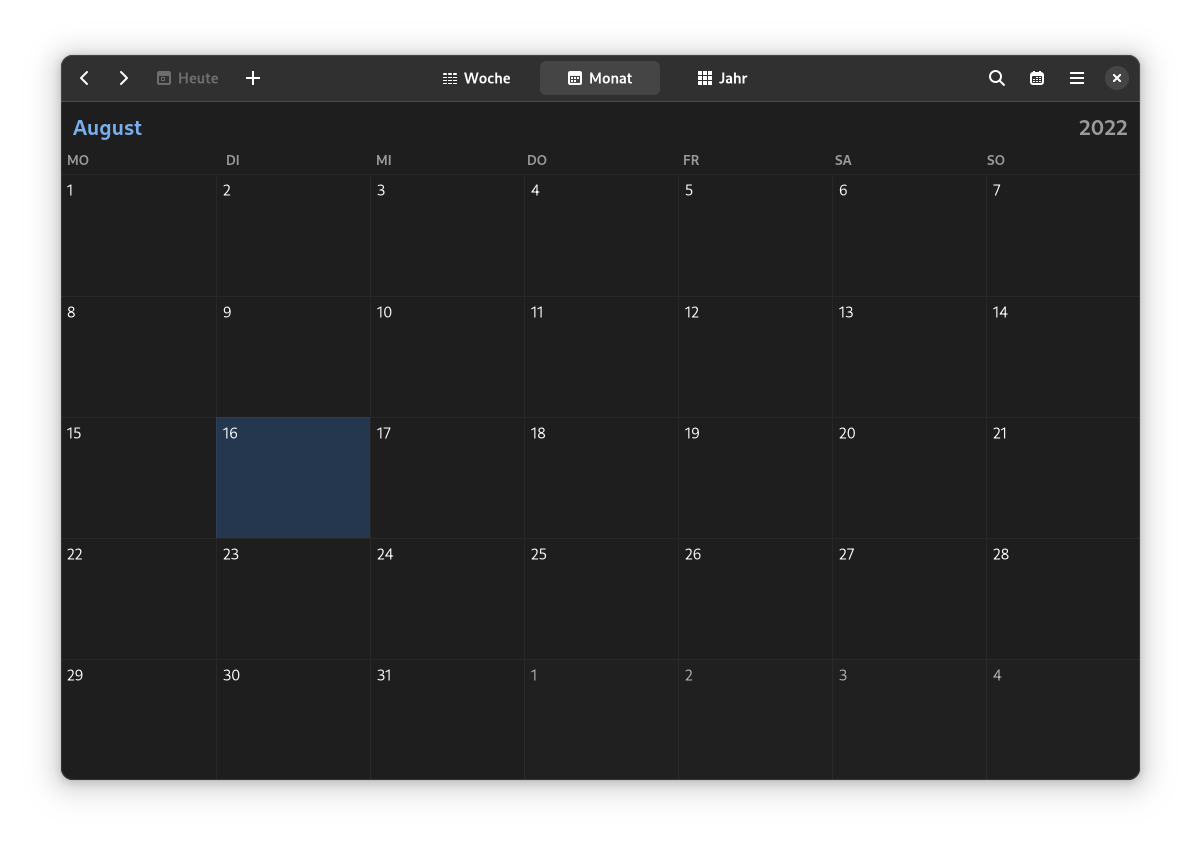 Als Vergleich hier der Kalender von KDE. Das bei den Symbolaktionen offenbar sogar scrollen kann, dann noch ein ganzes Menü anbietet und insgesamt halt extrem unübersichtlich wirkt.