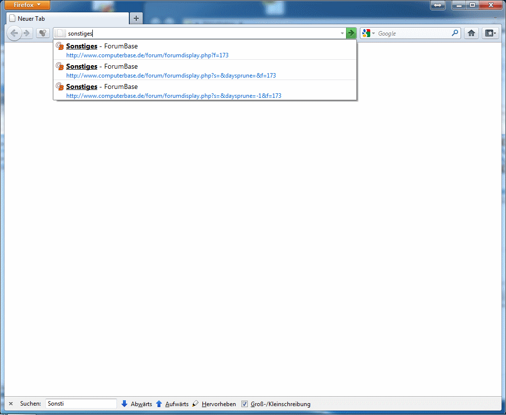 Nun nutze ich eine Funktion des Firefox, dass ich bei besuchten Webseiten oftmals die "Titelbezeichnung" eingebe und so die Webseite erneut besuche (vgl. Anhang)
