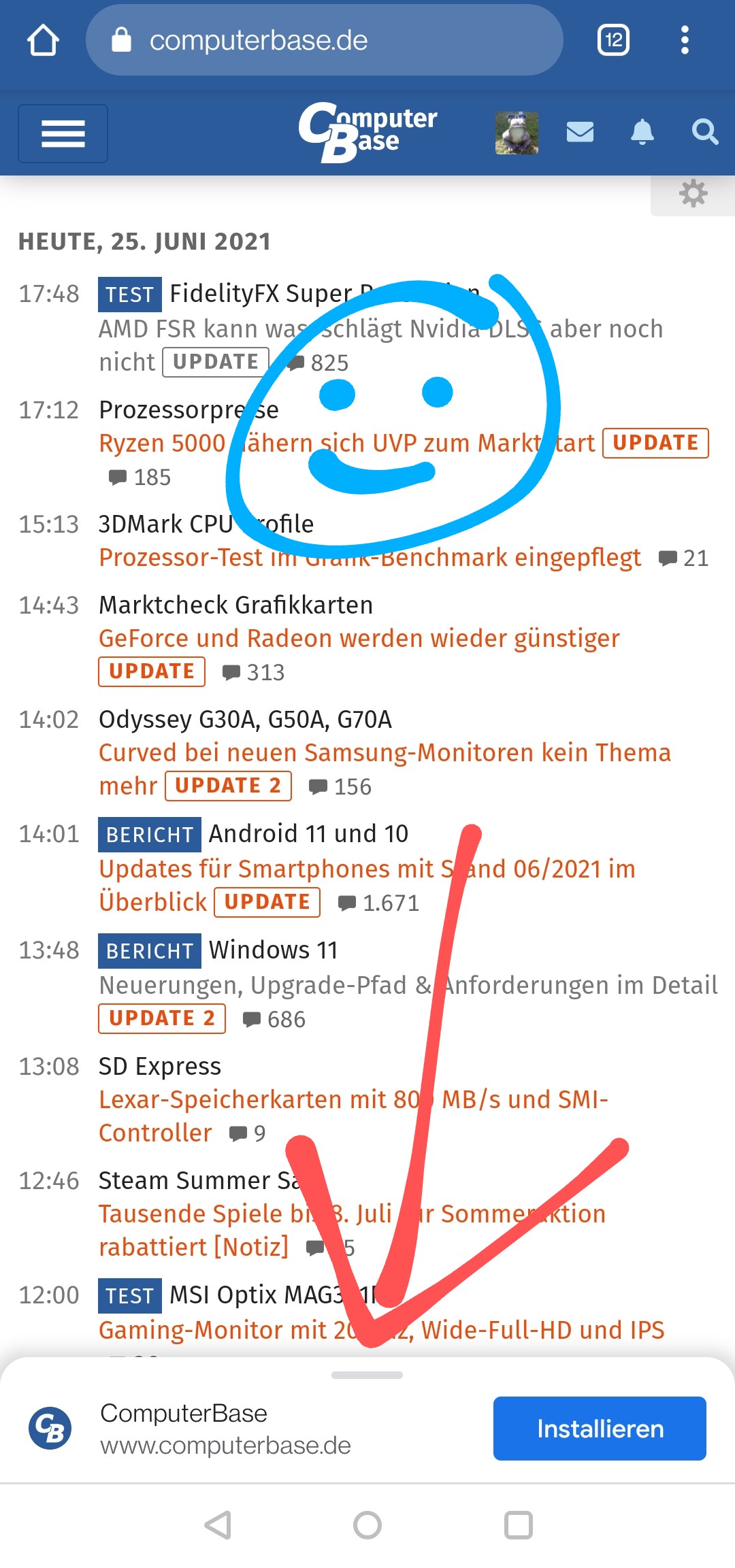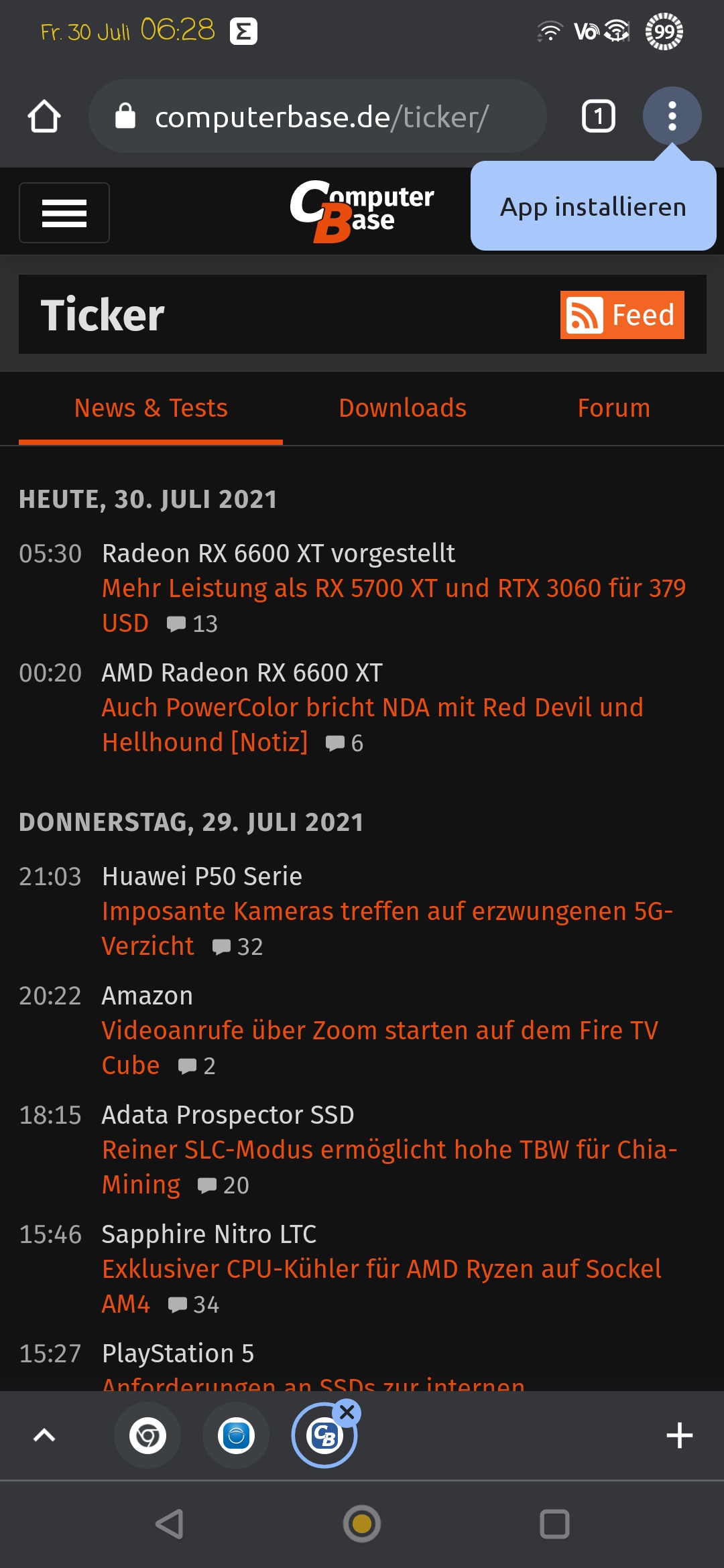 Google Chrome zeigt auf ComputerBase PWA (Progressive Web App) Install Prompt an