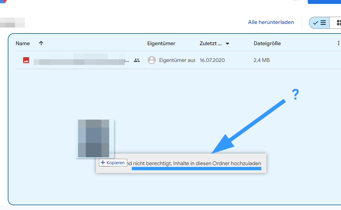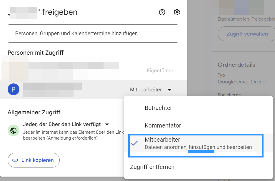 ich versuche im Moment einen Ordner bei Google Drive zu teilen mit jemandem ohne Google Konto. Schon beim Erstellen einer Zugriffsberechtigung steht dort: