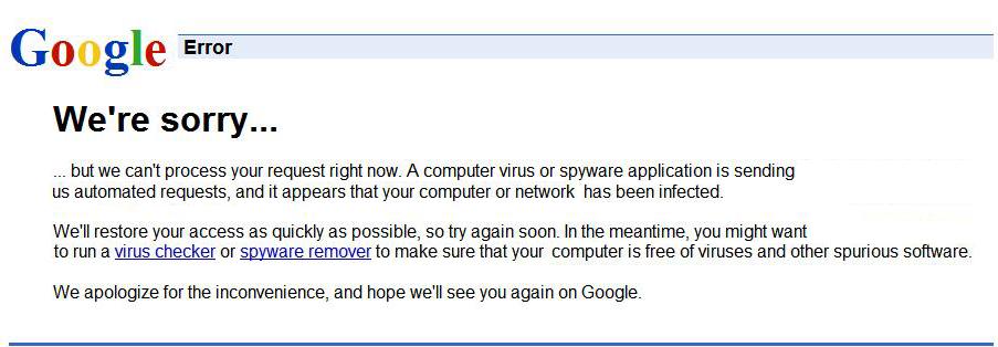 ich bekomme im Moment ab und an von Google statt Suchergebnissen eine Meldung, dass ein Virus o.ä. automatische Anfragen an Google schickt (was Google wohl nicht mag