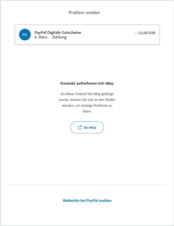 Paypal sagt mir aber jetzt, dass ich den Code bei eBay gekauft hätte und ich das Problem doch bitte mit ebay klären soll.