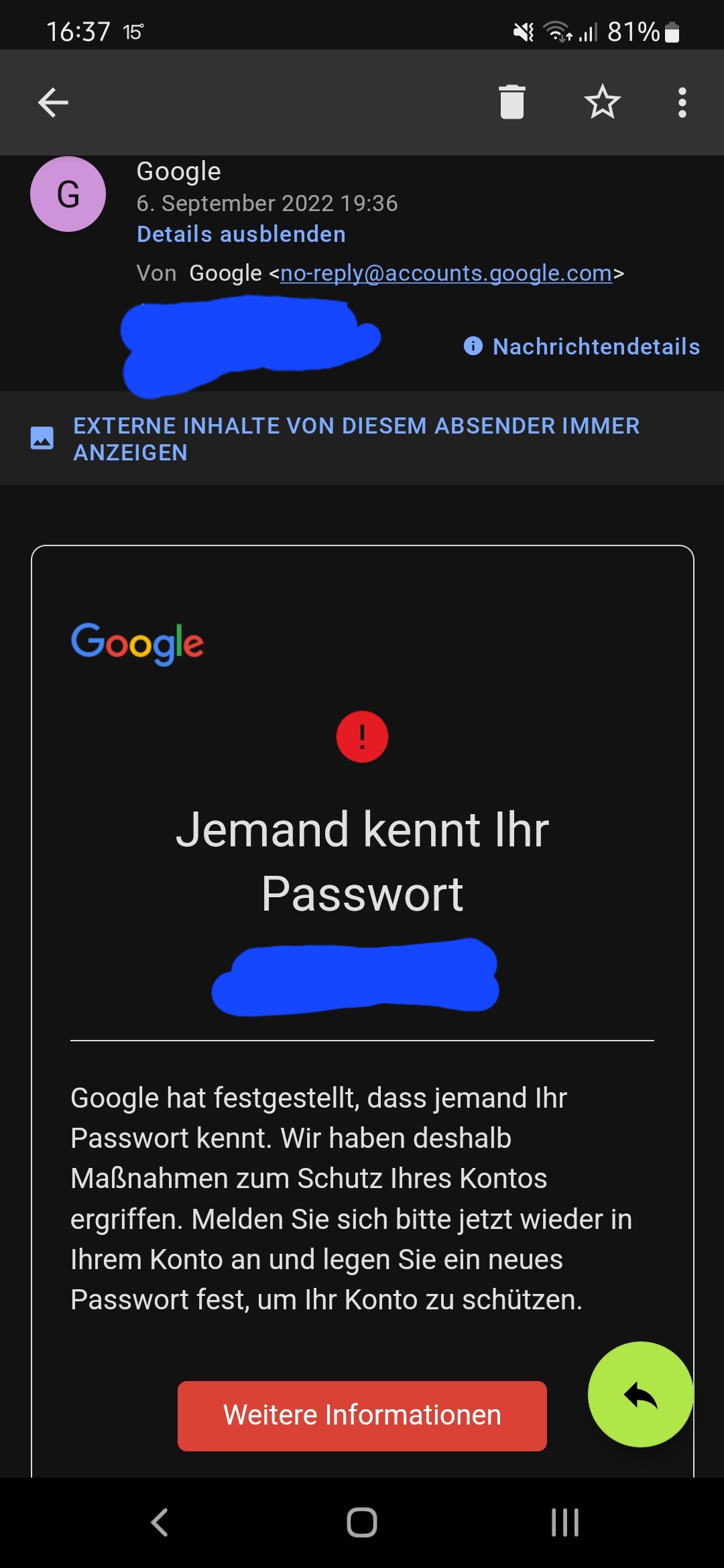 ich habe eine E-Mail von Google erhalten, mit dem Titel "Kritische Sicherheitswarnung" und im Text steht das jemand mein Passwort kennt. Was mich stutzig macht ist , dass ich keine Nachricht an meine Googlemail Adresse, sondern nur an meine Zweit Mail Adresse (GMX) die zur Wiederherstellung hinterlegt wurde, erhalten habe. Wenn ich in meinen Google-Konto bei letzte sicherheitsrelevante Aktivitäten schaue, ist dort nichts zu sehen. Unter meine Geräte ist auch nichts ungewöhnliches zu sehen. Ist das nun eine Fake E-Mail oder wie kommt diese Sicherheitswarnung zustande?