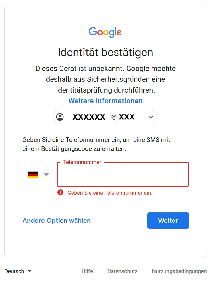 Den Code füge ich beim Google-Login ein, nach klick "Weiter" wird dann nach einer Telefon-Nr. gefragt und hier geht's nicht mehr weiter: bei klick "Andere Option wählen" passiert nichts, Telefon-Feld leer lassen oder fake-Nr. eingeben funktioniert auch nicht.