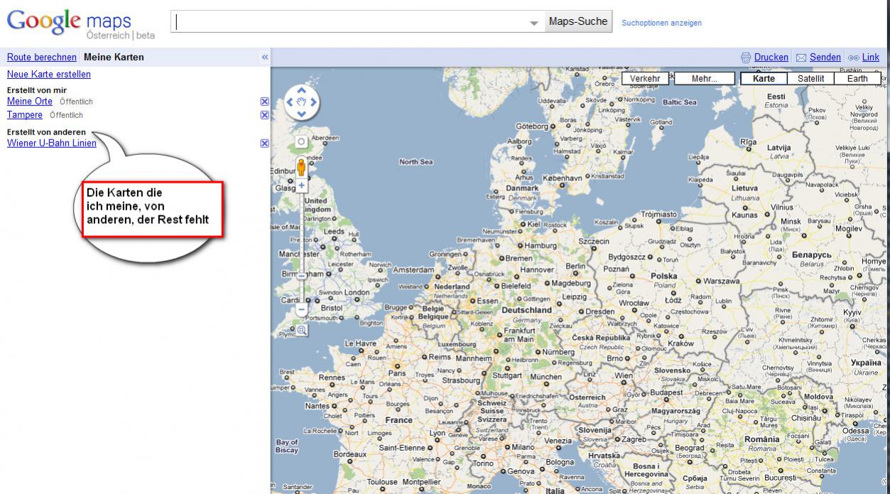 Bei Google Maps gibts/gab es Karten erstellt von anderen. Die erschienen immer, wenn man auf eigenen Karten wechselt. Da waren nützliche Dinge drin wie "Tool zum Messen von Entfernungen" oder die U-Bahn Stationen von Wien sowieso andere nützliche Dinge wie ein Overlay der OpenStreetMap und dergleichen. Leider finde ich das bei mir nicht mehr und wollte mal nachfragen wo ich das wieder herbekomme? Die ich bereits hatte verschwinden mit der Zeit und ich habe keine Ahnung wo das hin verschwunden ist. Habs auch mit mehreren Browsern versucht, es ist nicht mehr da.