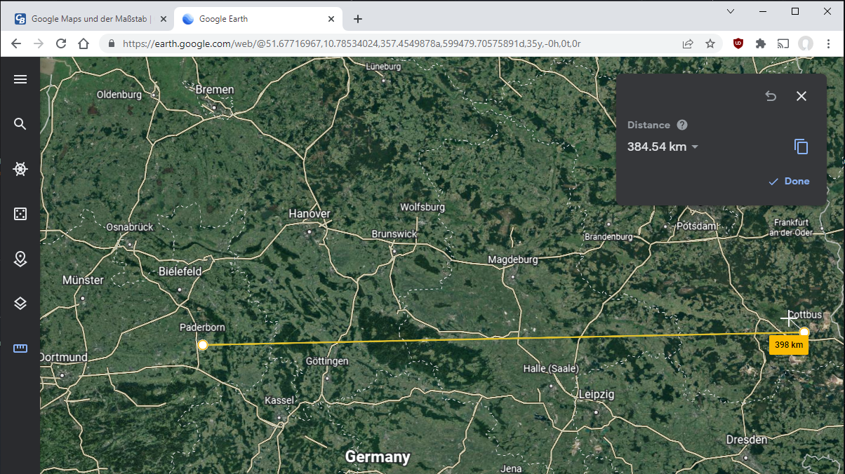 Manchmal nutze ich Google Maps, um mit Screenshot und Grafikprogramm die Luftlinie zwischen zwei Städten zu messen. Der angegebene Maßstab besteht selbst aus einer dicken Linie. Welcher Abstand sind denn genau 100 km? Die Strecke von der Mitte der Linie bis zur anderen Mitte? Oder die Strecke innerhalb dieser schwarzen Linie? Die Frage mag etwas spitzfindig wirken, ich möchte aber schon eine genaue Antwort habe, damit ich richtig rechnen kann.
