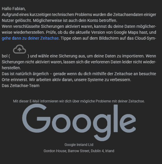 Das hat auch einwandfrei funktioniert - bis Freitag, 07.03. Aufgefallen ist es mir am Samstag, 08.03. als ALLE Einträge in der Vergangenheit weg waren. Ich habe die Zeitachse durchgehend aktiviert, keine automatische Löschung und auch nichts manuell gelöscht. Was mir auffällt: Am Freitag gab es ein Update der Google Maps App. Auf meinem Smartphone (Samsung Galaxy Note10+) ist als letzte Sicherung der Freitag genannt, obwohl mittlerweile für gestern und heute (08.03. & 09.03.) neue Daten vorliegen und korrekt aufgezeichnet werden. Im Februar hatte ich öfter das Problem, dass die Zeitachse ungenau war / Lücken hatte - da habe ich dann teilweise manuell nachgeholfen und gehofft, das es wieder besser wird (war in der Vergangenheit schonmal so).