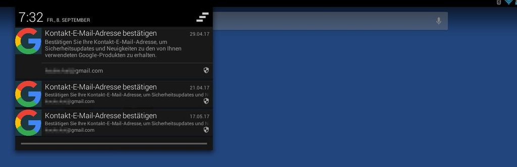 ich habe hier auf einem Android 4.2 Tablet drei Meldungen unterschiedlichen Datums von Google mit der Bezeichnung "Kontakt-Emailadresse bestätigen".