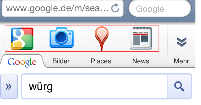 Ich bekomme noch einen Anfall mit den §&$&§% Icons, die immer erst dann aufploppen, wenn ich ganz nach oben auf die Suchleiste möchte (iP4). Wenn die Dinger wenigstens ohne Verzögerung auftauchen würden, wäre alles halb so schlimm. So tippe ich immer daneben und darf wieder neu anfangen zu suchen oder immerhin wieder von "Bilder" auf "Suche" wechseln.