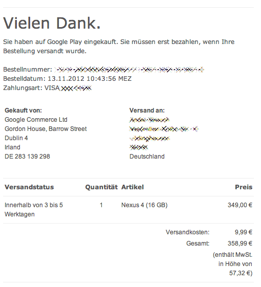 Dann habe ich eine Email erhalten dass ich ein N4 16GB bestellt hätte, bei Play reingeschaut und siehe da es wurde eine gültige Bestellung ausgelöst. Soll das einer verstehen, ich hatte nie eine "Vielen Dank für Ihre Bestellung" Meldung. Aber trotzdem freu mich natürlich.
