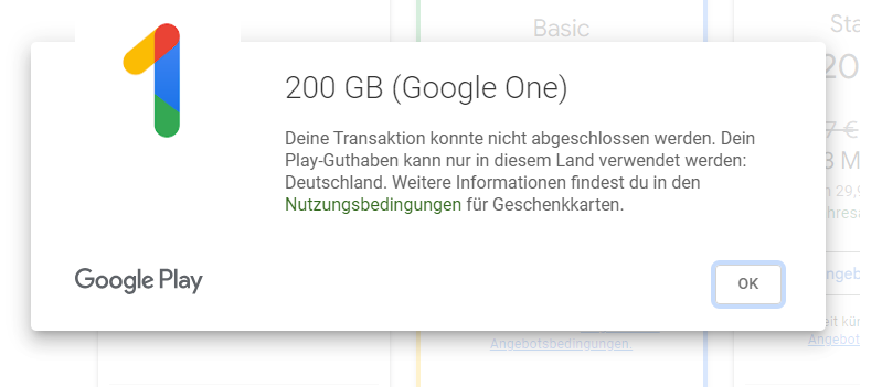 ich versuche für meine Tante Google One zu kaufen und verzeifel einfach nur Bodenlos.