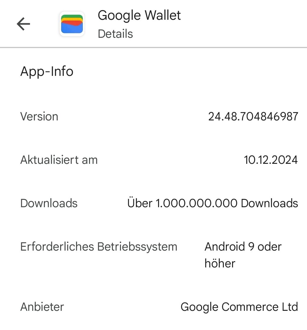 Trotz Update auf GOOGLE WALLET Version 24.48.704846987