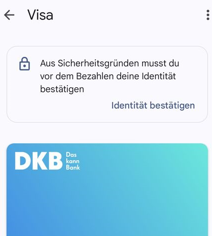 Wenn ich die Google Wallet App öffne (egal wann, auch schon vor dem Bezahlvorgang), erscheint dort die Meldung "Aus Sicherheitsgründen musst du vor dem Bezahlen die Identität bestätigen", siehe Screenshot. Diese Meldung verschwindet, wenn man auf "Identität bestätigen" geht und die PIN eingibt, kommt aber beim nächsten Öffnen der App erneut.