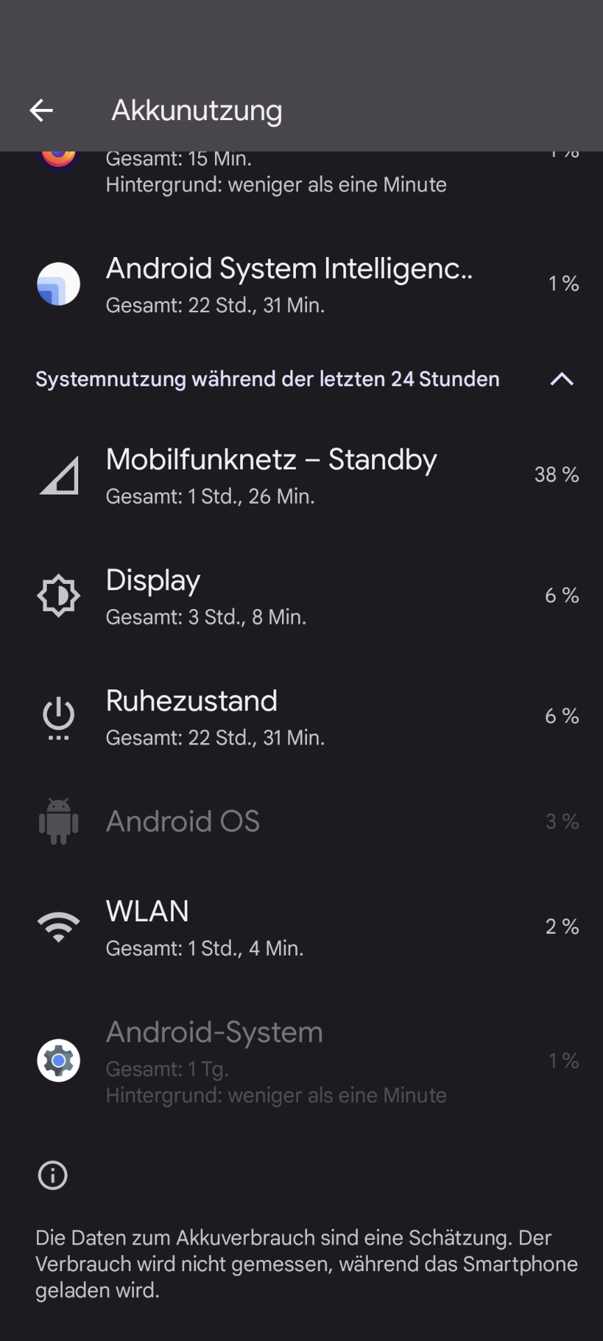 Viele denken, dass der idle Verbrauch vom "Mobilfunk - standby" hoch wäre. Dabei werden Screenshots präsentiert, die dann 30%+ zeigen, aber nur 1 Balken ausgewählt wurde. Problem ist hier eher, dass hier Android 12 die Werte relativ anzeigt. Sprich wenn ein Balken (2Std Zeitfenster) nur 0,5% des Gesamtakkus verbraucht hat, so werden die einzelnen Teilverbräuche wieder relativ angegeben. Sprich es sind dann 30% von 0,5%.