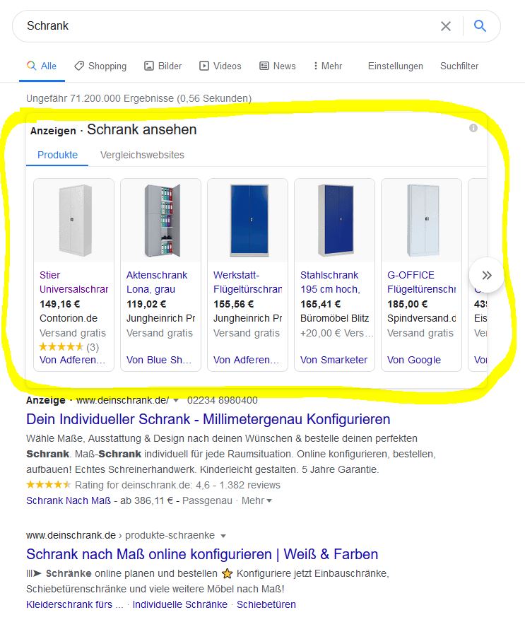 Beim googlen werden in der Trefferliste ganz oben die Google Anzeigen eingeblendet.