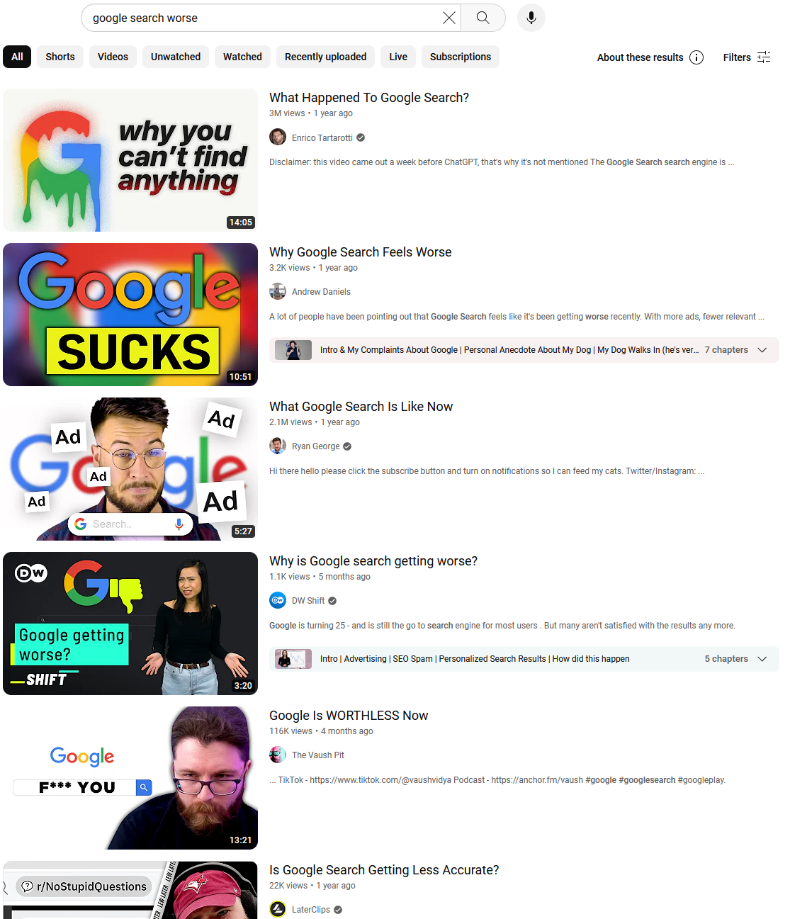 bin ich der einzige, der findet, dass die Google-Suche immer schlechter wird bzw. schlechter geworden ist? Vielleicht bilde ich es mir auch nur ein und die Google-Suche war schon immer schlecht, aber es wurmt mich immer mehr.