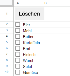 Bisher ist es so, dass es eine einfache Liste ist, wo die zu kaufenden Artikel aufgeführt sind. Nach dem Kauf, wird die gesamte Zeile manuell gelöscht. Nun hätte ich gerne eine bequemere Lösung, damit gesamte Zeilen gelöscht werden.